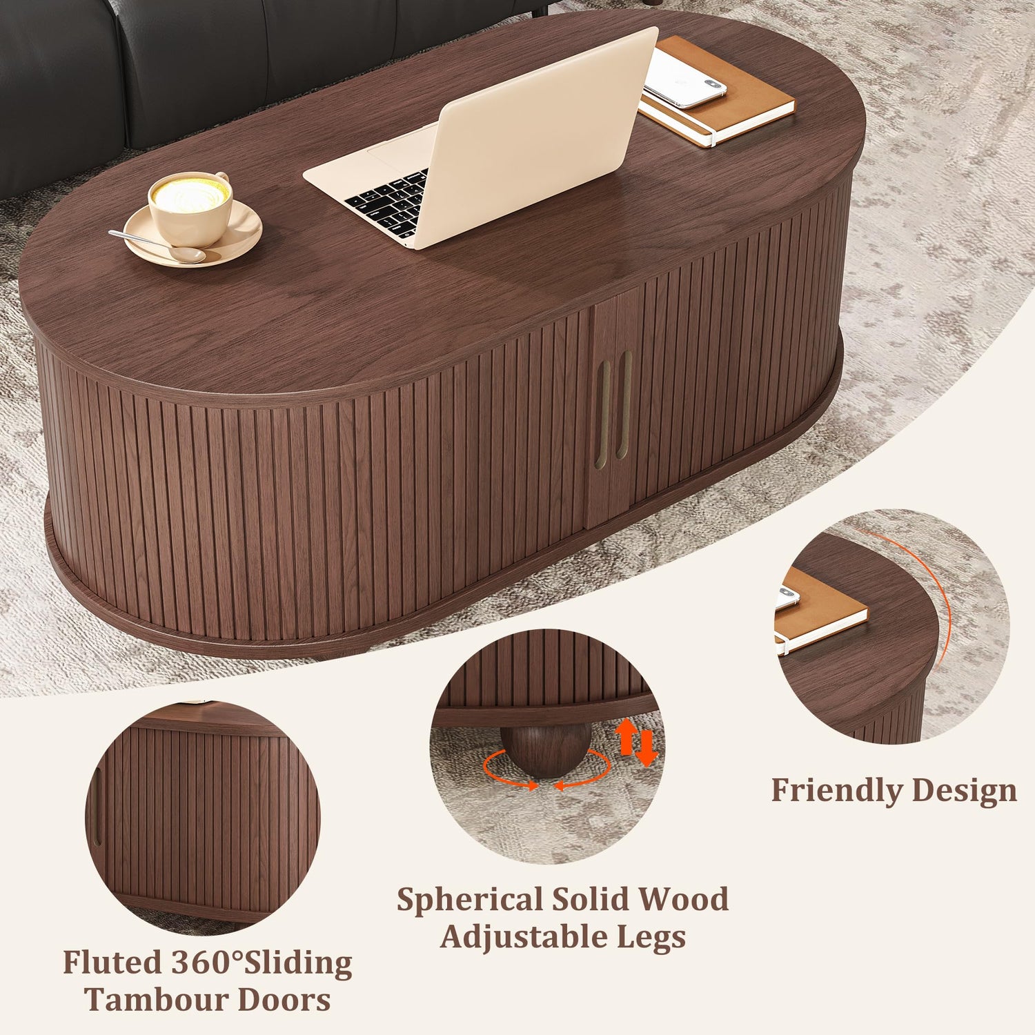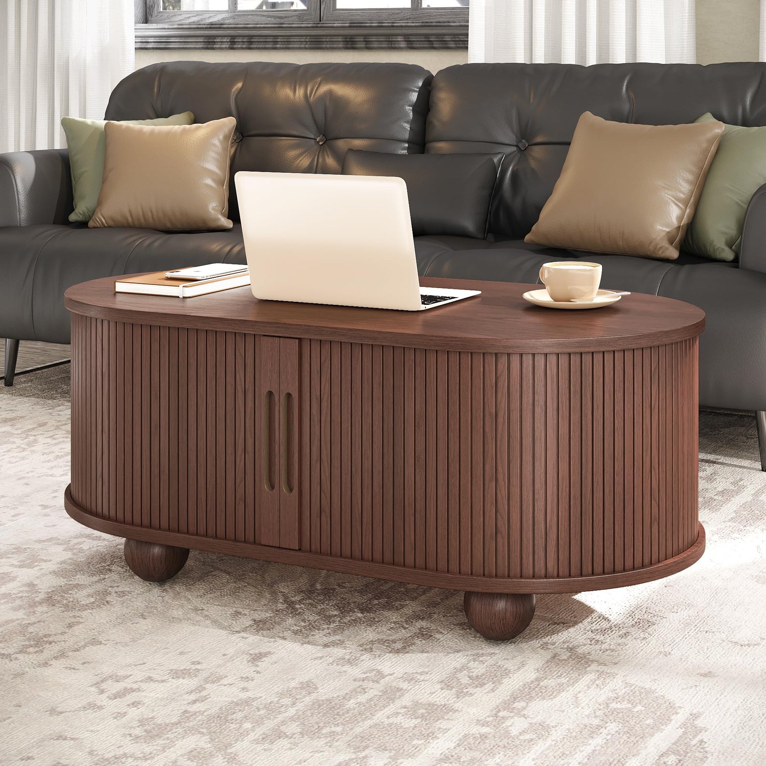 Alohappy Oval Coffee Table, Mid Century Modern Coffee Table with Sliding Tambour Doors, Fluted Center Table with Hidden Storage for Living Room, Dining Room, Apartment, Home Office, Dark Brown