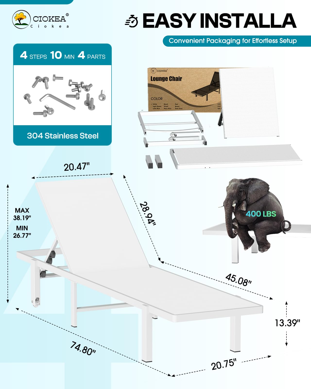 - Convenient Installation: The chaise lounge chair is constructed with a lightweight, aluminum frame, allowing for easy movement. Installation takes only 10 minutes