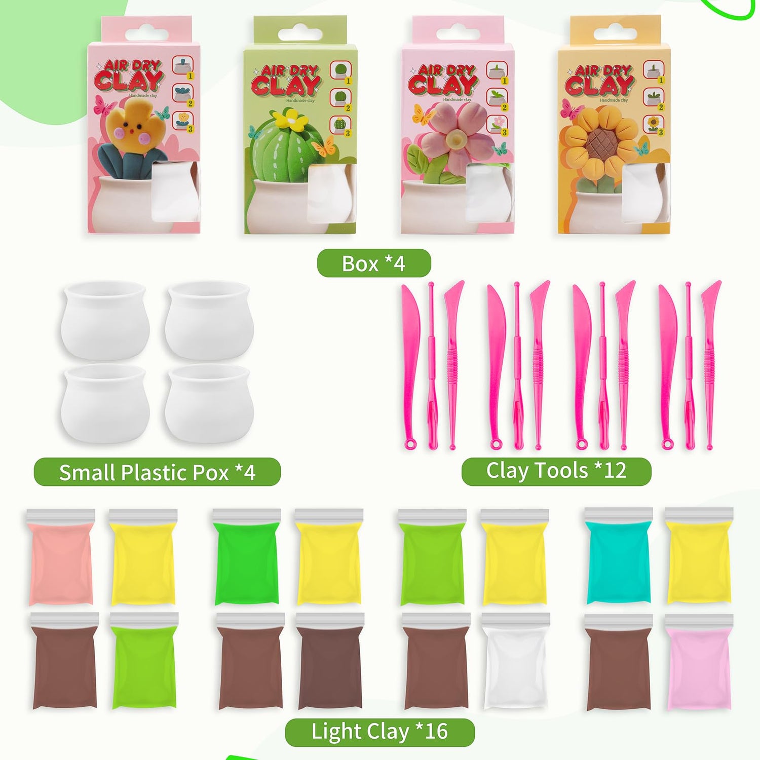 - ALL-IN-ONE CLAY CRAFT KIT: Includes 4 boxes of ultra-light air dry clay in various colors, specially designed for creating adorable succulent plant pots. Perfect for art projects, creative play, and skill development.