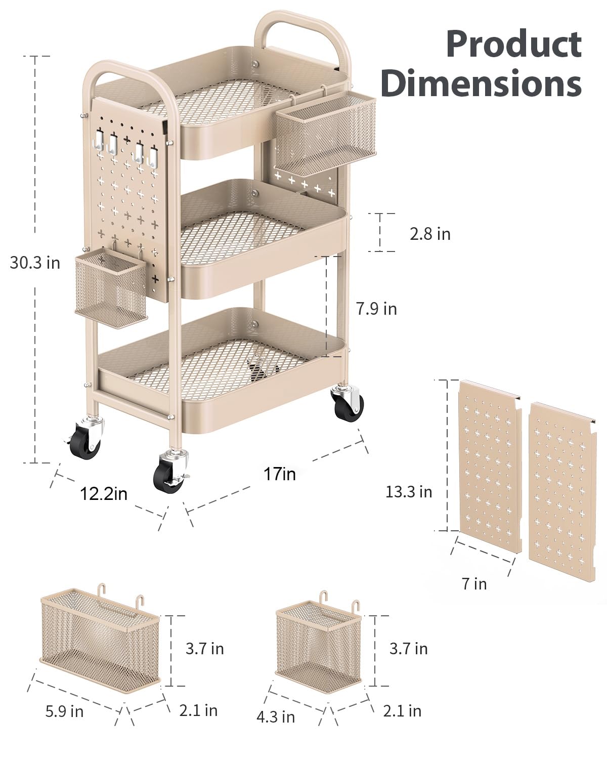 - 【Special DIY Pegboard】This 3 tier rolling cart features 2 metal DIY pegboard that can be positioned on the front or side according to your preference. You can also freely add hooks to the pegboard for storage. Additionally, the rolling cart comes with two hanging baskets and four hooks, significantly enhancing storage space and catering to your DIY needs.