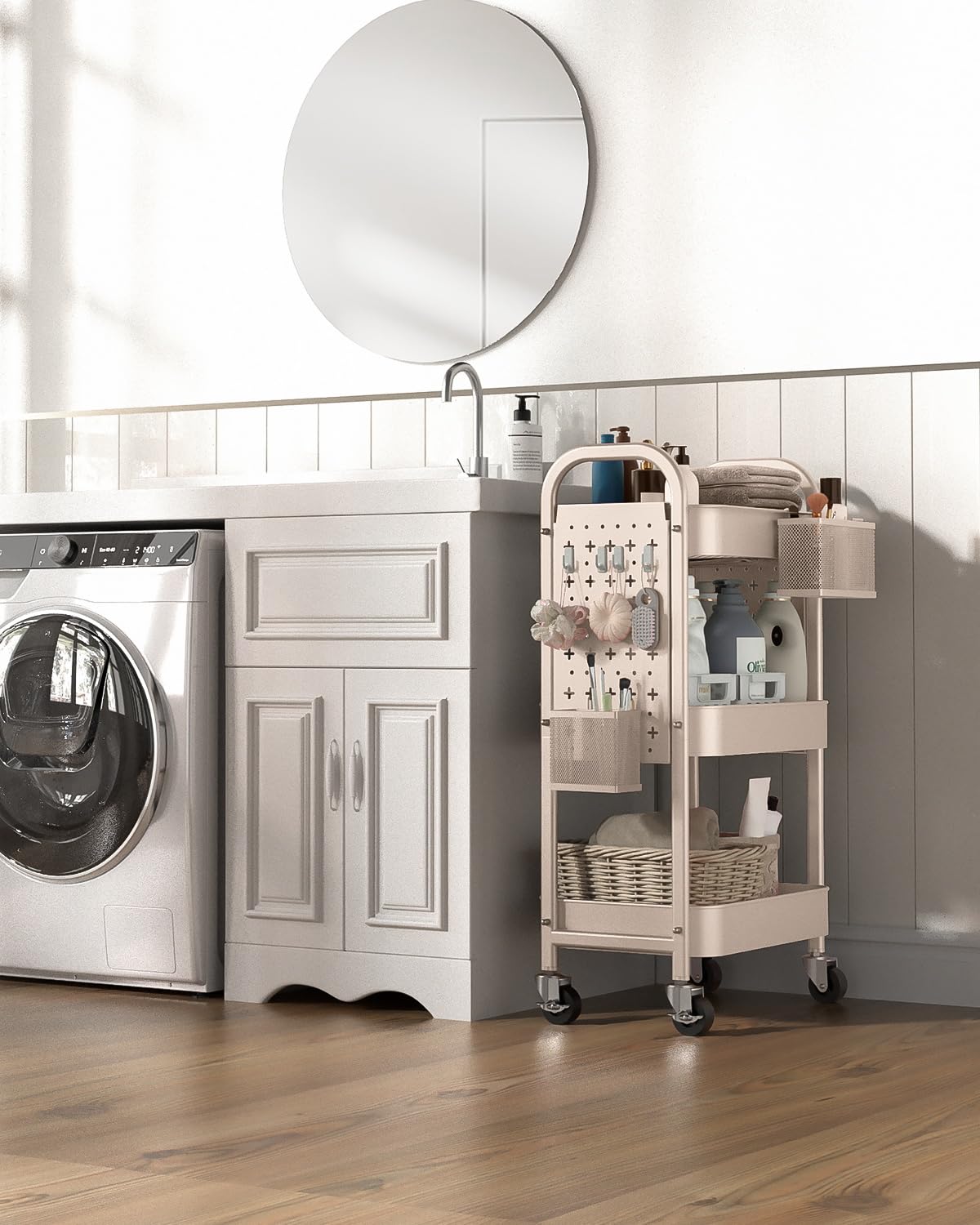 ALVOROG 3 Tier Rolling Cart with DIY Pegboards Metal Utility Cart with Wheels Handles Baskets Hooks, Craft Cart for Office Kitchen Bathroom(Khaki)