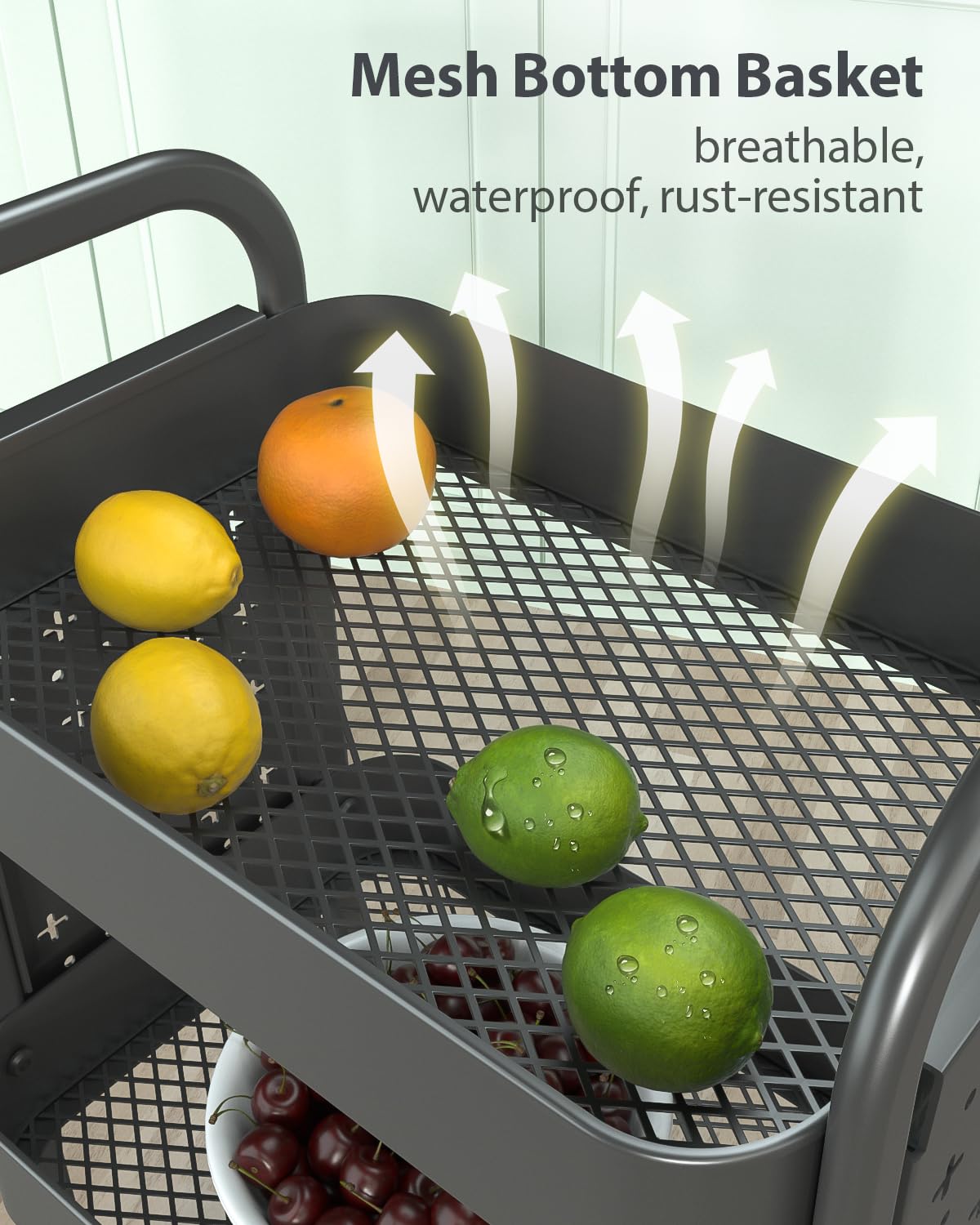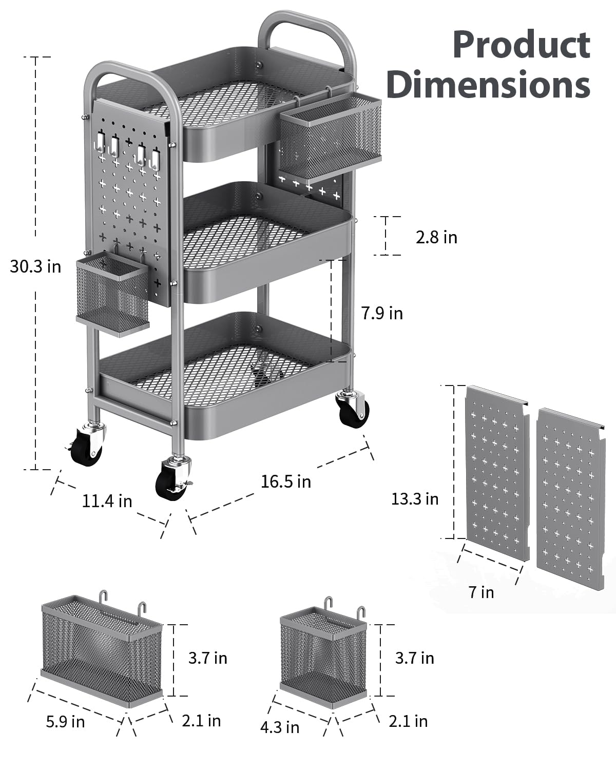 - 【Special DIY Pegboard】This 3 tier rolling cart features 2 metal DIY pegboard that can be positioned on the front or side according to your preference. You can also freely add hooks to the pegboard for storage. Additionally, the rolling cart comes with two hanging baskets and four hooks, significantly enhancing storage space and catering to your DIY needs.