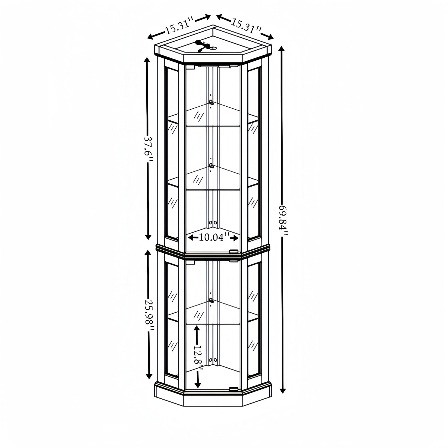 Details: Elevate your living space with this stunning Corner Glass Cabinet Lighted Curio Cabinet Corner Display Case. Crafted with meticulous attention to detail, this cabinet offers a perfect blend of functionality and elegance. Its corner design seamlessly integrates into any room, maximizing space utilization. The tempered glass panels and interior lighting create a captivating showcase for your cherished collectibles, antiques, or wine collection. Proudly display your prized possessions while adding a touch of sophistication to your living room or den. With ample storage and adjustable shelves, this curio cabinet allows you to organize and highlight your treasures in style. Enhance the ambiance of your home with this versatile and visually striking corner display case.