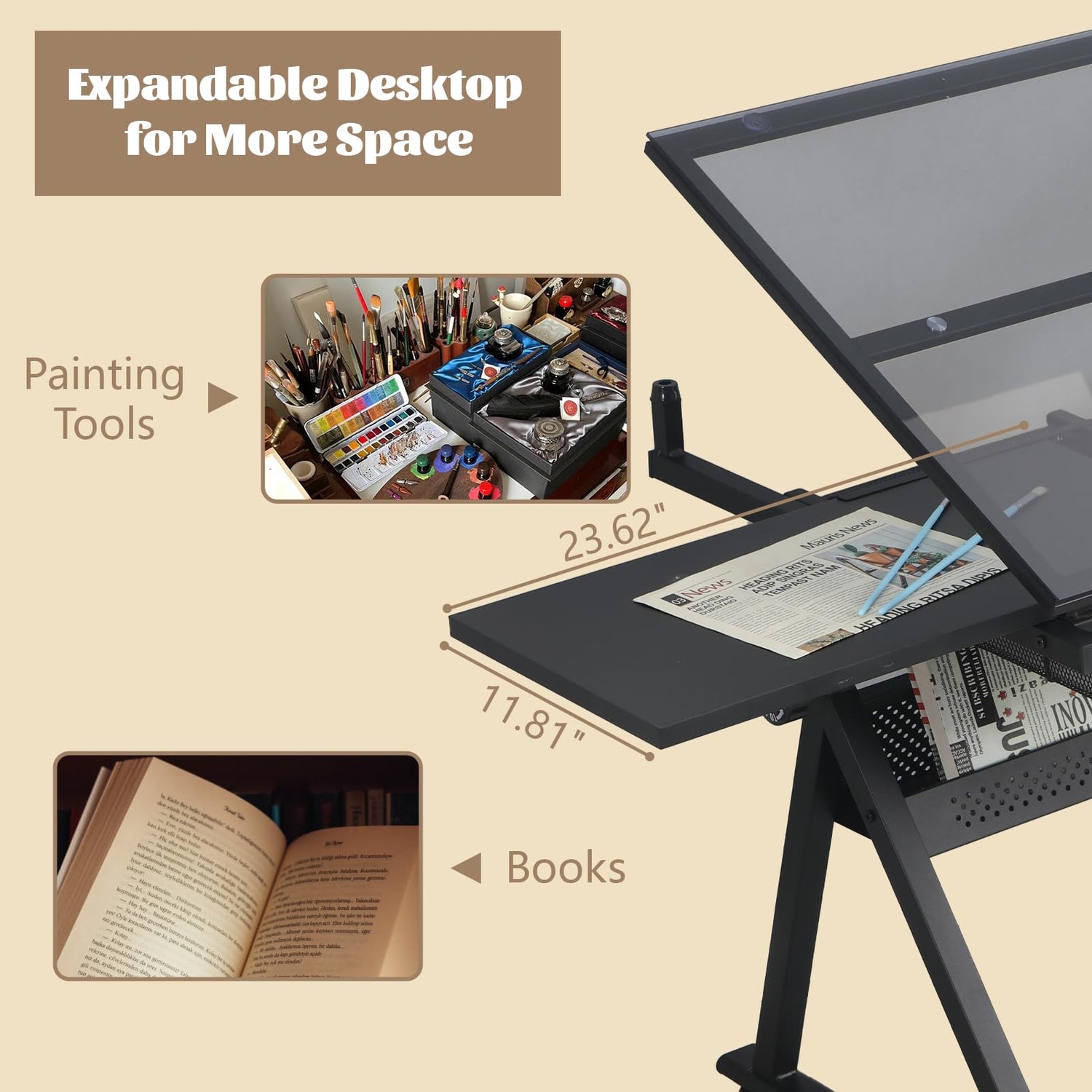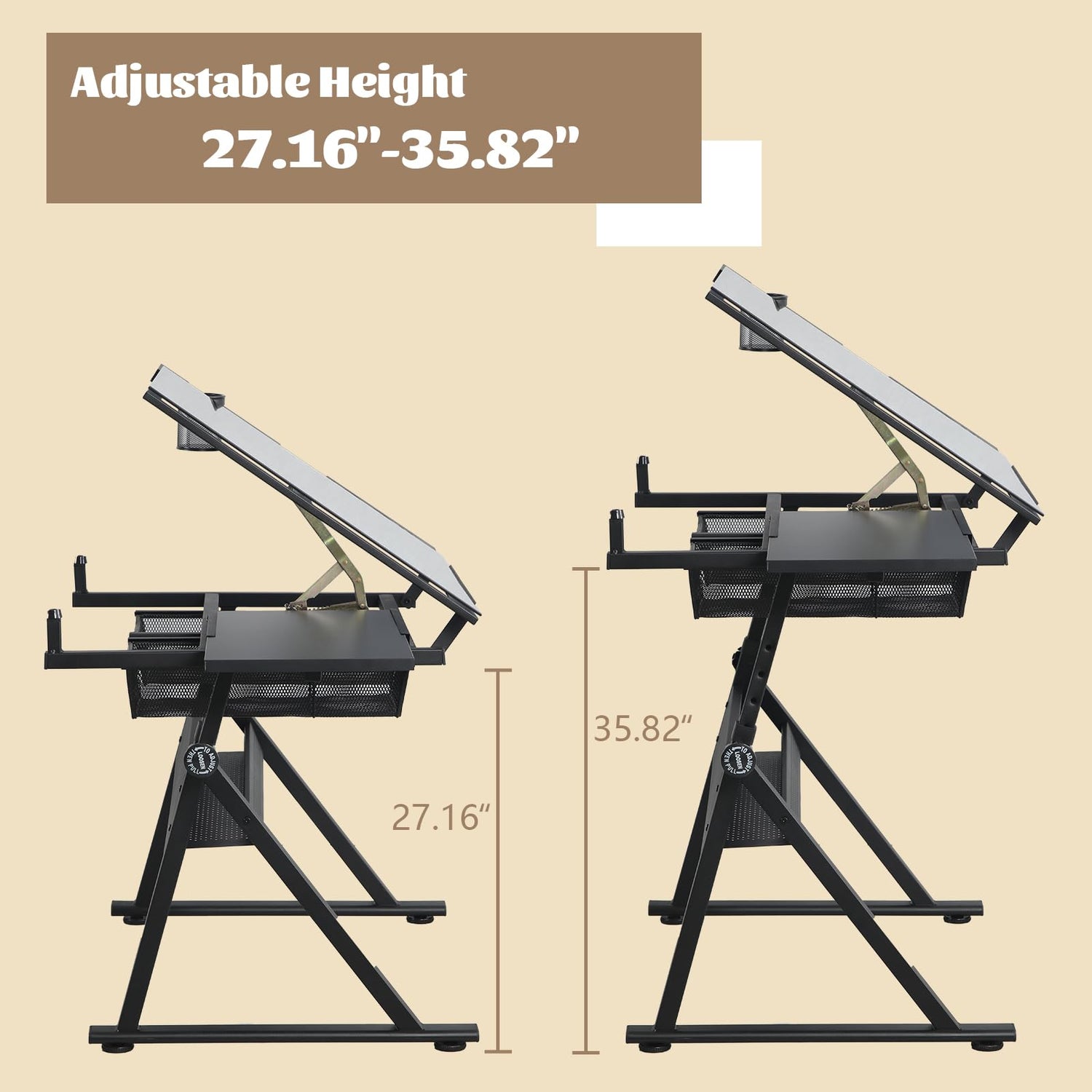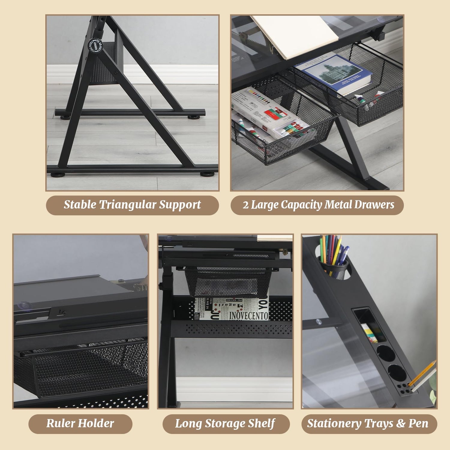 - 【Sturdy & Stylish Construction】Crafted with premium full-transparent glass surface, complemented by a durable powder-coated iron frame, this adjustable height drafting table exudes elegance while ensuring solid stability. Equipped with nonwoven drawers, it seamlessly accommodates all your essential tools, making it ideal for drawing, crafting, and painting alike