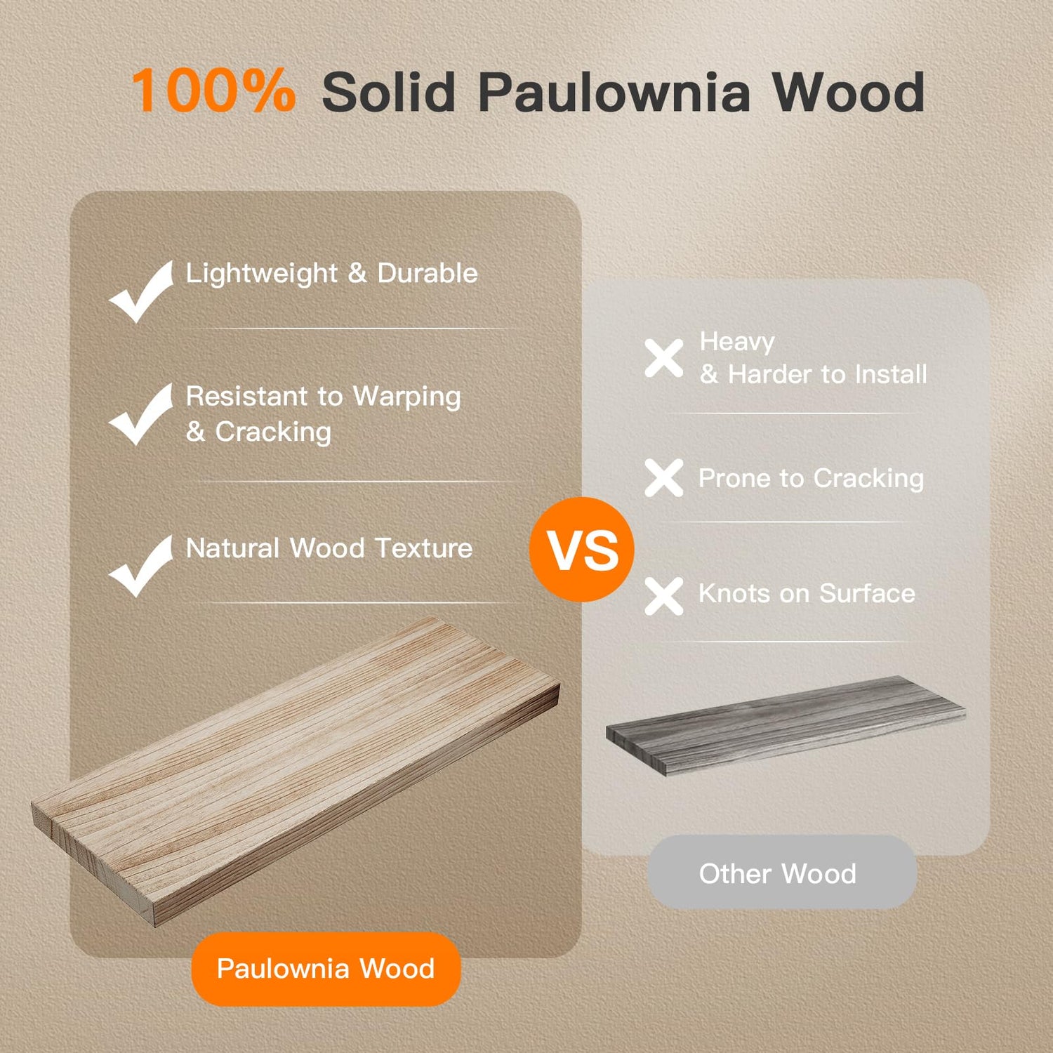 Crafted from 100% solid paulownia wood, these shelves boast a fine wood grain and an attractive finish that enhances their natural appeal. One of the standout features of paulownia wood is its remarkable resistance to decay, warping, and pests, ensuring that these shelves remain a beautiful and practical choice for your décor.