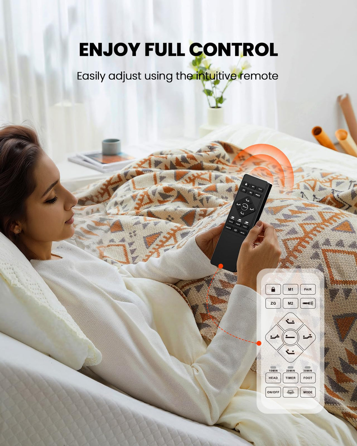 - Relaxing Massage Feature: Experience soothing comfort with this adjustable bed thanks to head and foot massage options. With three intensity levels and four modes, you can target specific areas to relieve muscle tension, reduce stress, and promote better circulation—all controlled via the included remote.