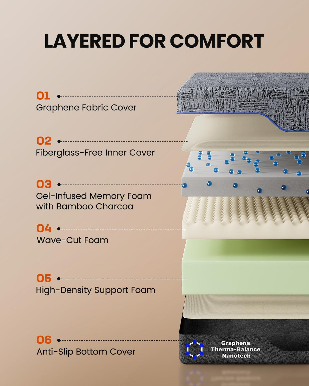 - Cooling Graphene Cover & Supportive Foam Layers: Stay cool with a breathable graphene-infused cover. Layers of gel-infused memory foam and wave-cut foam relieve pressure while supporting your spine. Medium-firm plus feel, CertiPUR-US certified, and fiberglass-free.