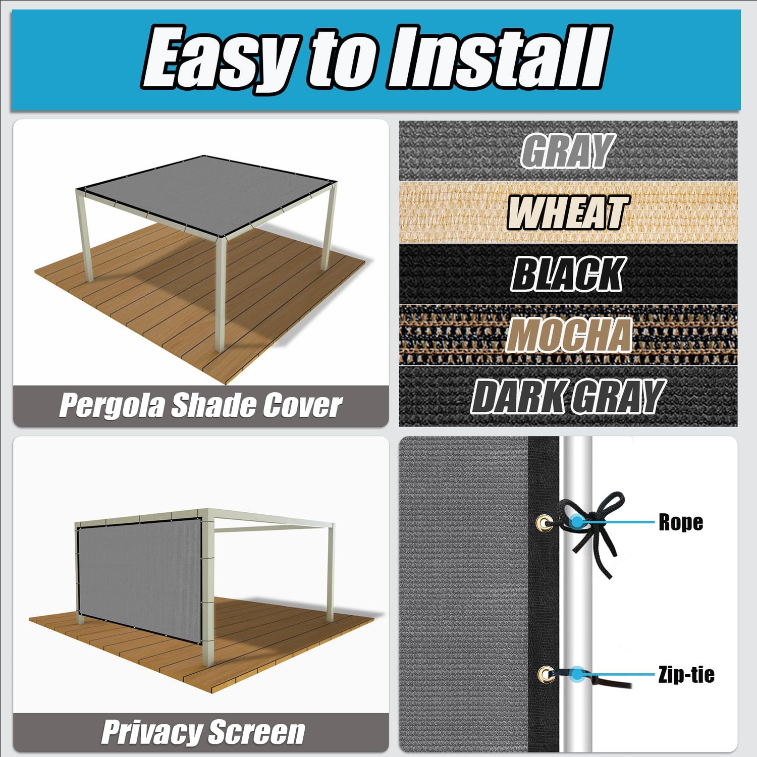 - 【Easy to Install】:The pergola shade cover package comes with cable zip ties for installation, which passes through the buckle and structure. One person can complete the installation in 10-30 minutes, depending on the size of the courtyard facilities.