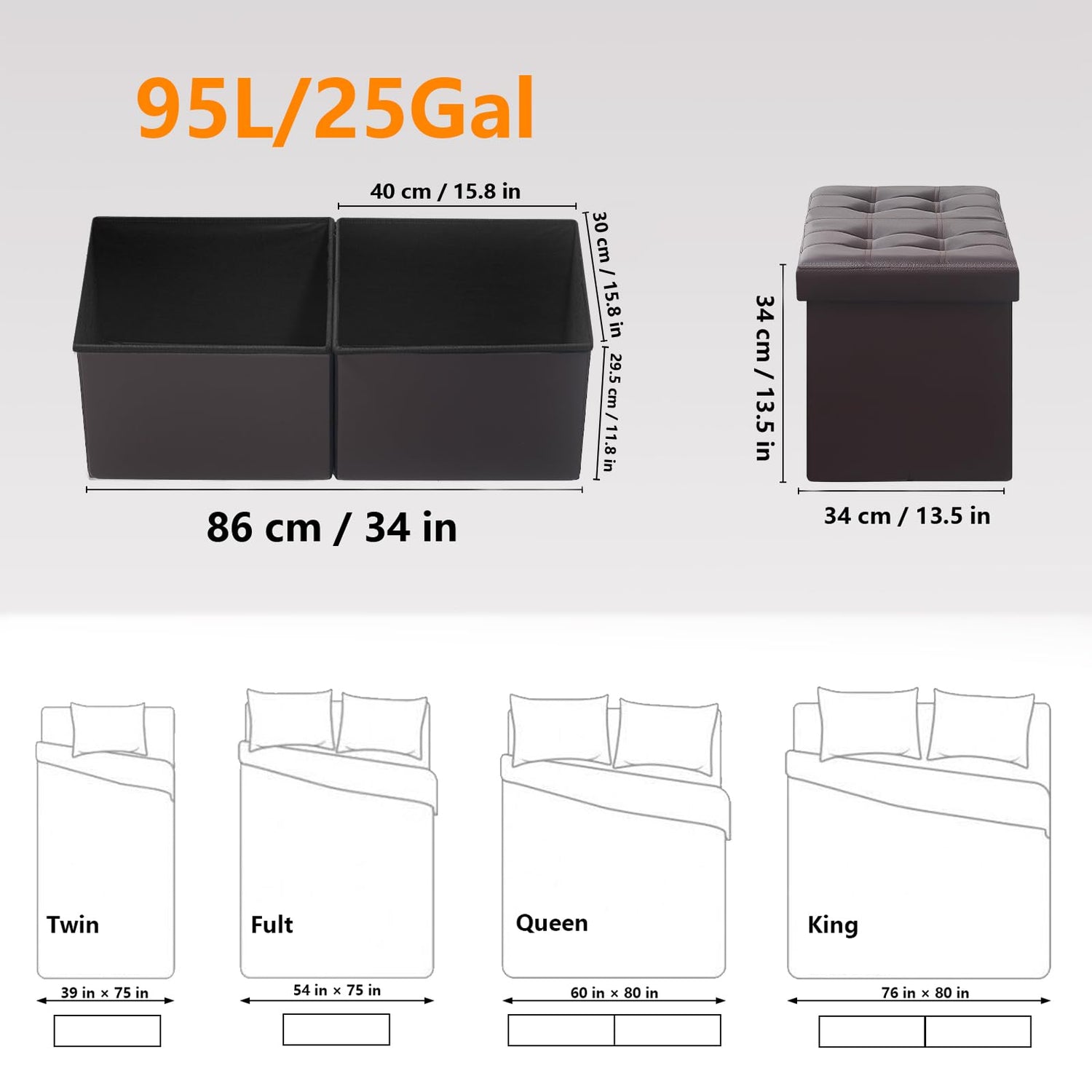 - 【Plenty of Storage Space】The folding ottoman bench sized 34”D x 13"W x 13”H (86 x 34 x 34 cm), can be reduces clutter in the home and allows you to store your blankets, cushions, books and sports equipment in the living room.