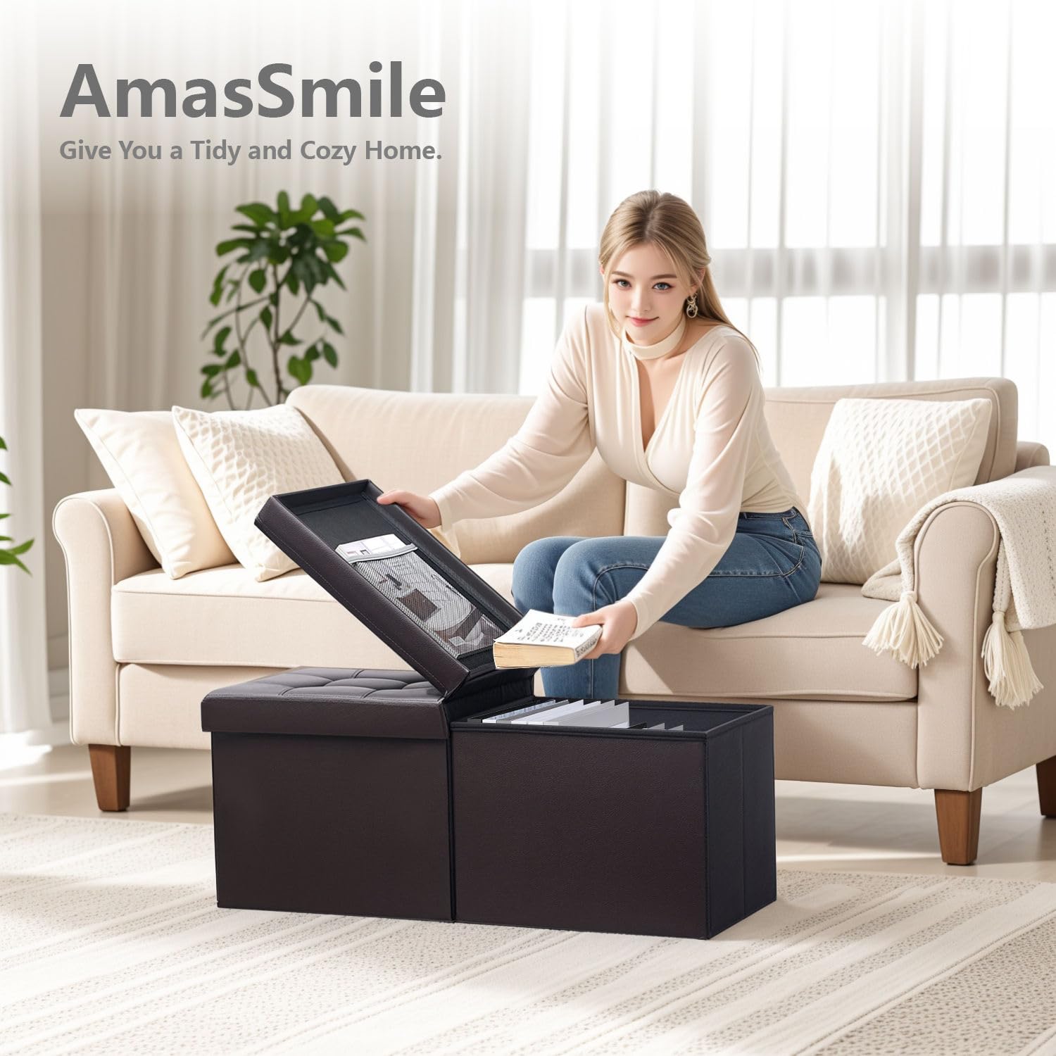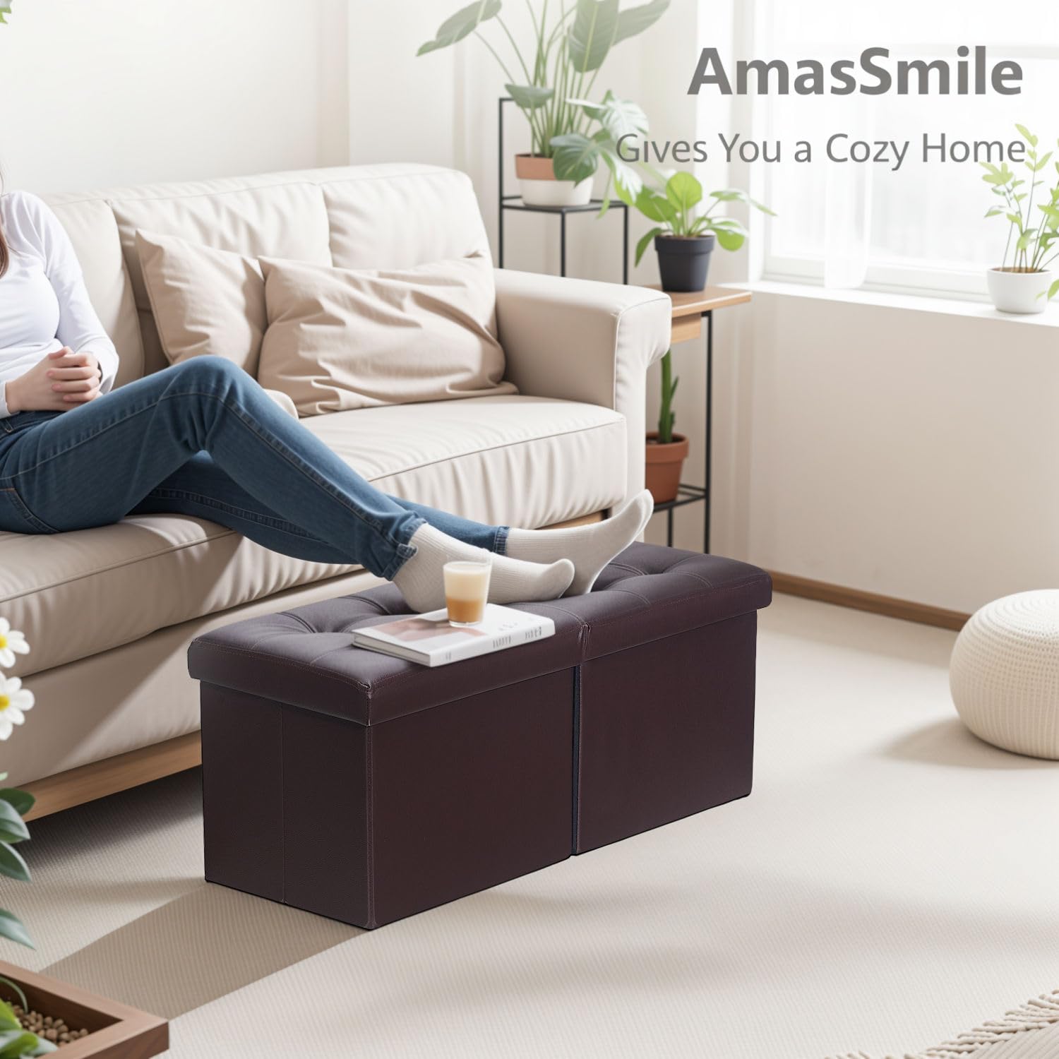 AmasSmile Footrest Ottoman Bench with Storage,34Inch Brown Leather Footstool, Coffee Table, Padded Seat, Storage Chest,Blanket Store with Flipping Lid for Livingroom and Bedroom