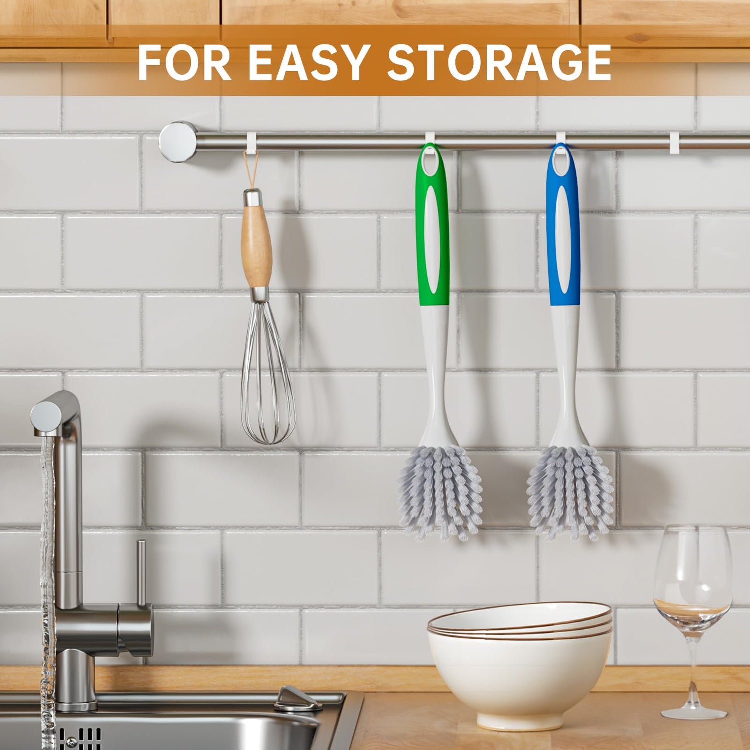 - Dish scrubber with loop handle: Dish washing brush scrubber with loop long handle can be hung over the sink to keep dry and clean. The long handled brush protects your hands from getting wet and touching the washing-up liquid while cleaning most things.