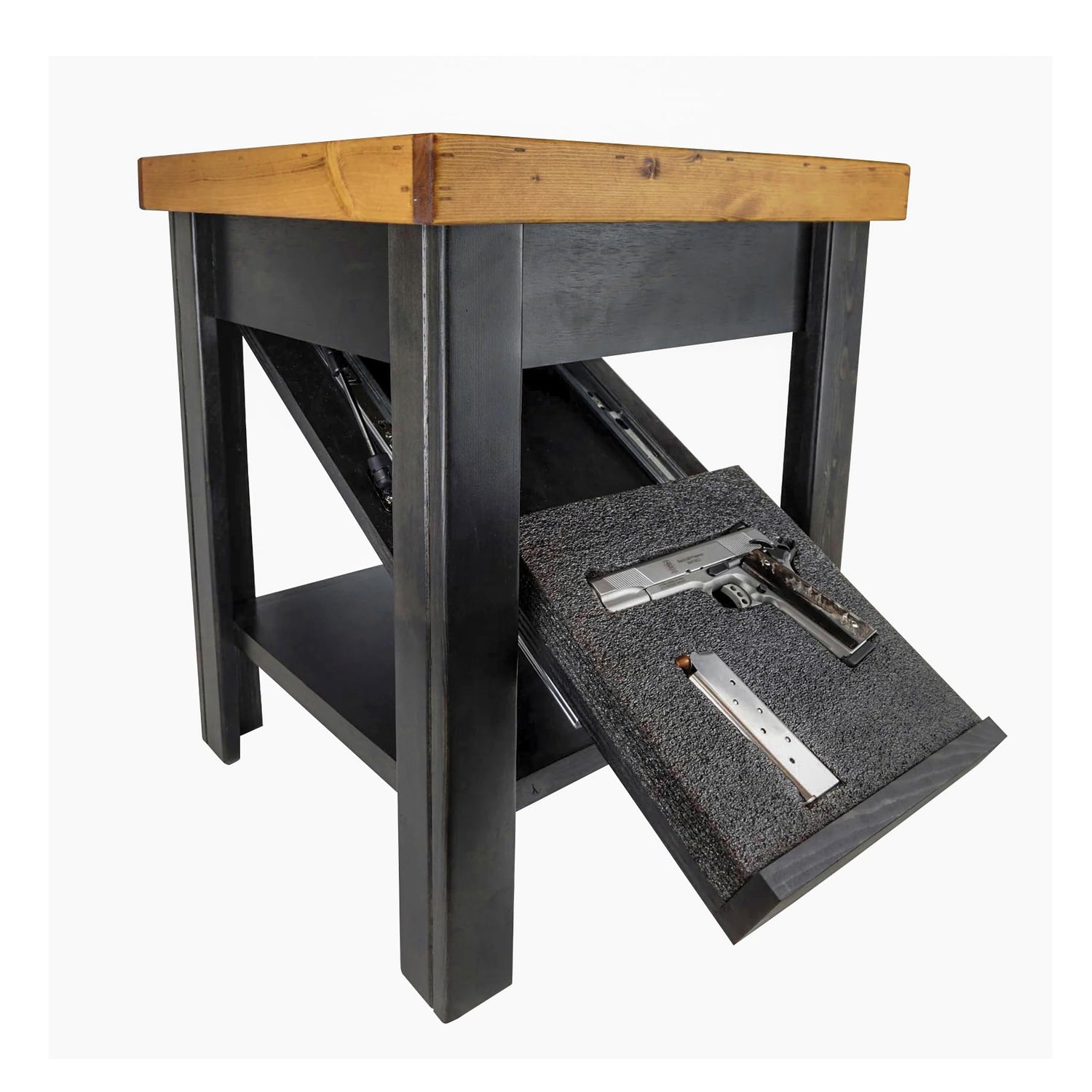 Details: Our masterfully constructed and stylish hidden compartment end table/nightstand is designed for those looking for enhanced and stylish bedroom security. This stunning nightstand with hidden gun compartment is available in chic black with a warm honey pine top. Made of rich wood solids and veneers which are locally sourced near our Missouri factory. It will bring both aesthetic and practical concealment to any room in your home.