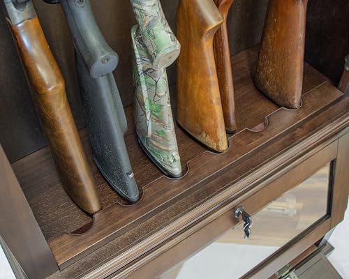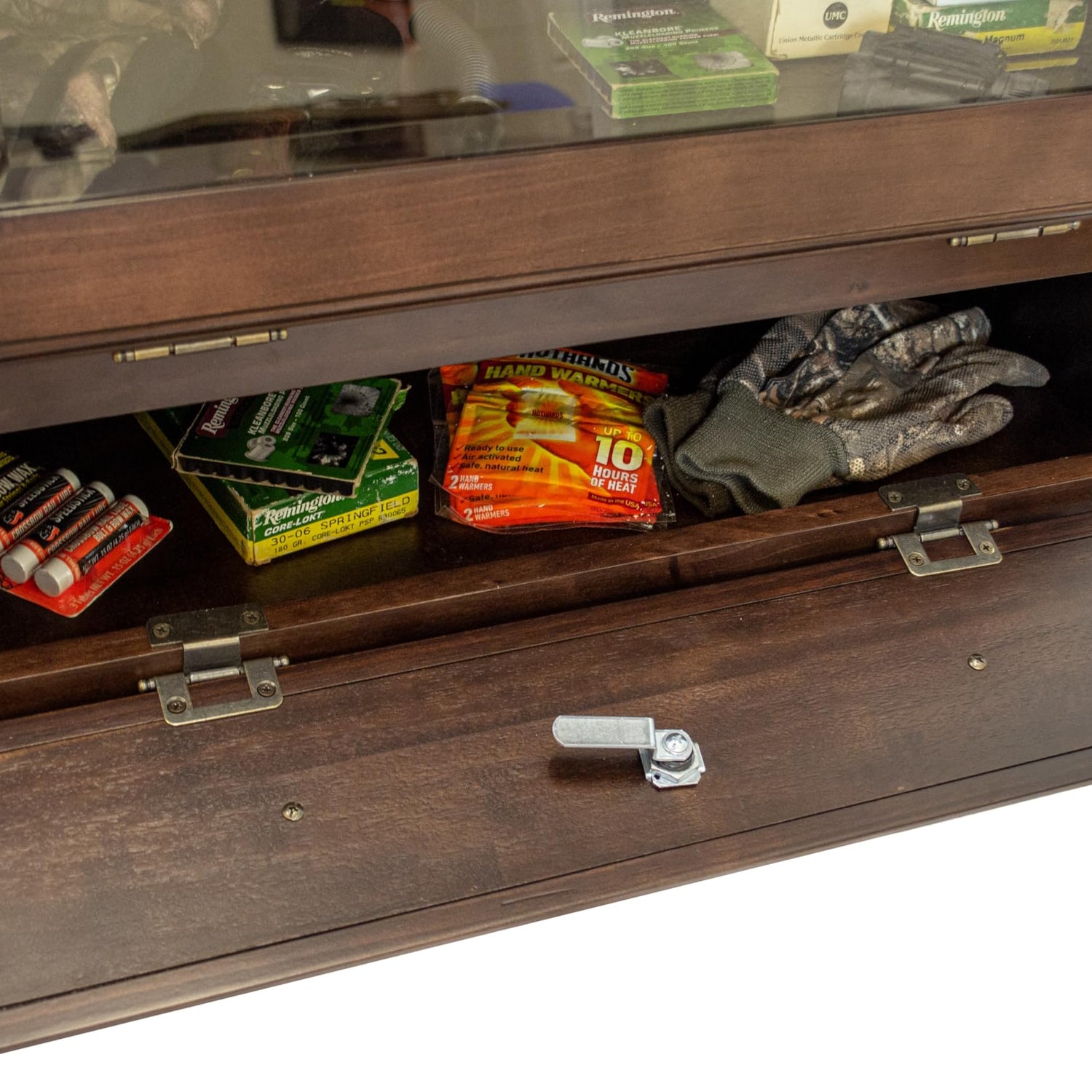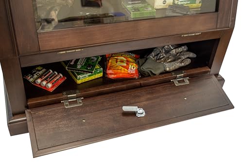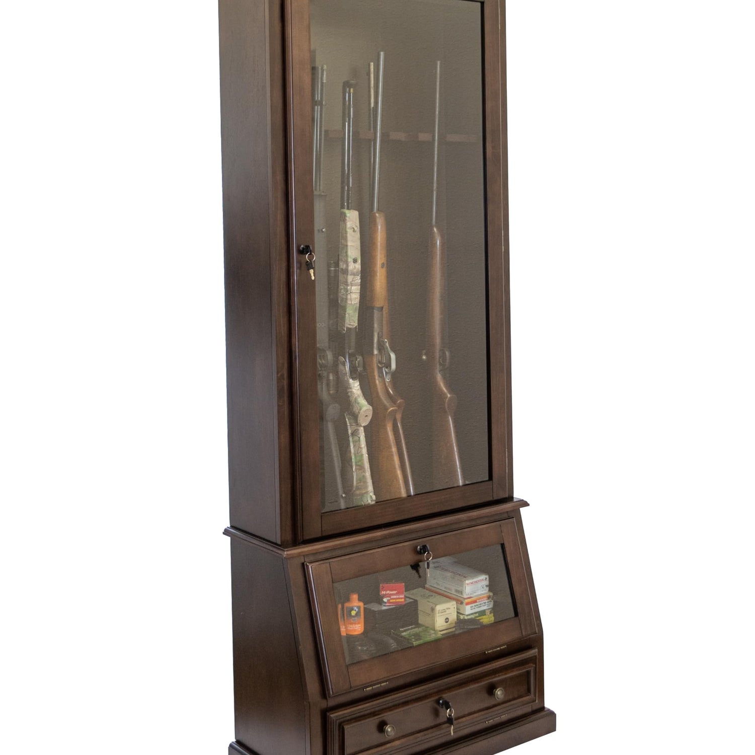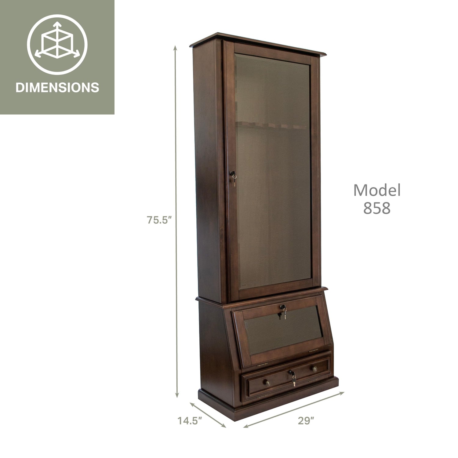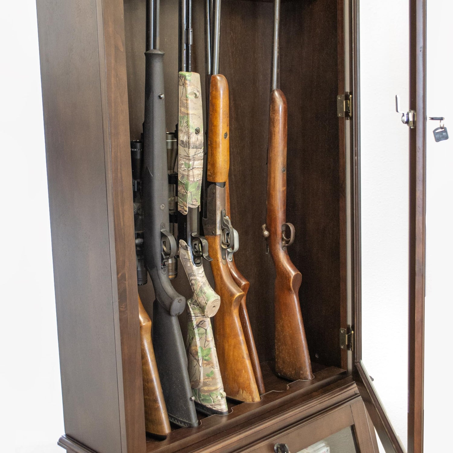 Details: This elegant gun cabinet combines security and style, featuring a locking slanted base and a framed, locking glass door that proudly displays up to 12 firearms while keeping them securely stored. Constructed of wood and wood veneers, a separate locking compartment in the base offers additional storage for ammunition, calls, or other essential items, ensuring organized and safe access. The warm espresso finish highlights the cabinet's refined design, making it a sophisticated addition to any den, study, or hunting lodge. Crafted for durability and functionality, this cabinet is a perfect blend of form and function for the responsible firearm owner.