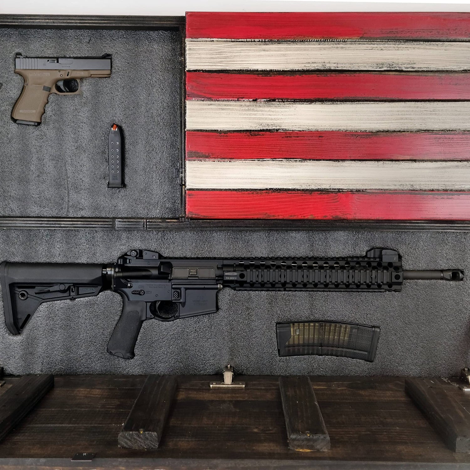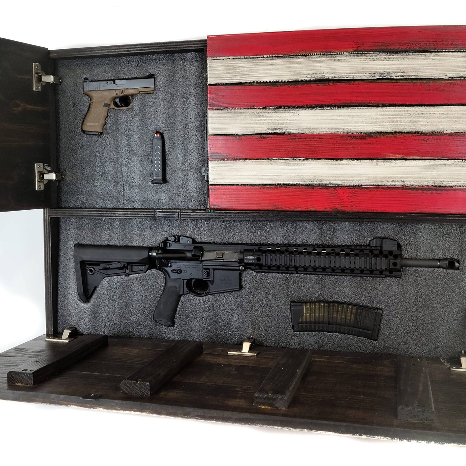 Details: This is an American Furniture Classics largest wooden concealment flag design. It features two hidden locking compartments lined with Kaizen closed cell foam that can be easily customized to fit a wide variety of items from handguns to knives. It features magnetic safety locks standard and the lower door features a gas strut for smooth reliable operation.