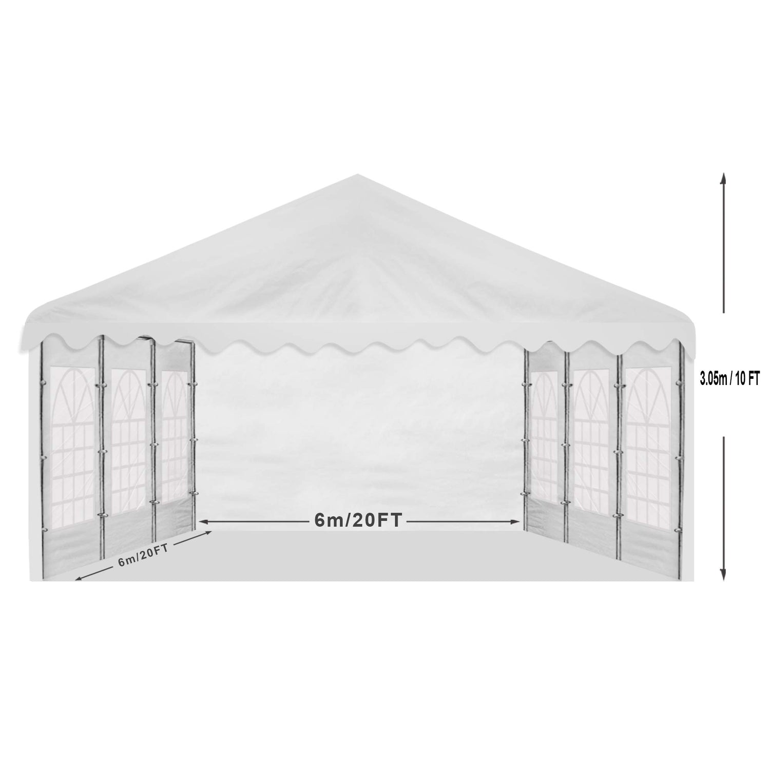 Size: 20'L (6m) x 20'W (6m) x 10'H (3.05m peak); 6.6'H (2m side)