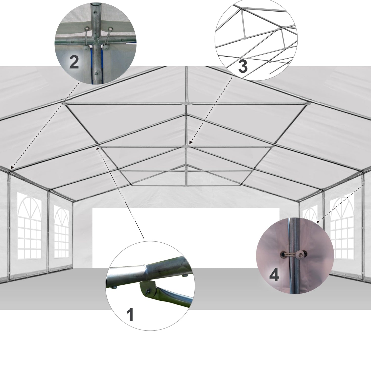 - Tent Poles: Galvanized Steel tubes. Rrust & corrosion resistant. Thicker pipe used for steel tubes. High quality, heavy duty framework, with durable metal connectors and metal base. With triangle roof' support