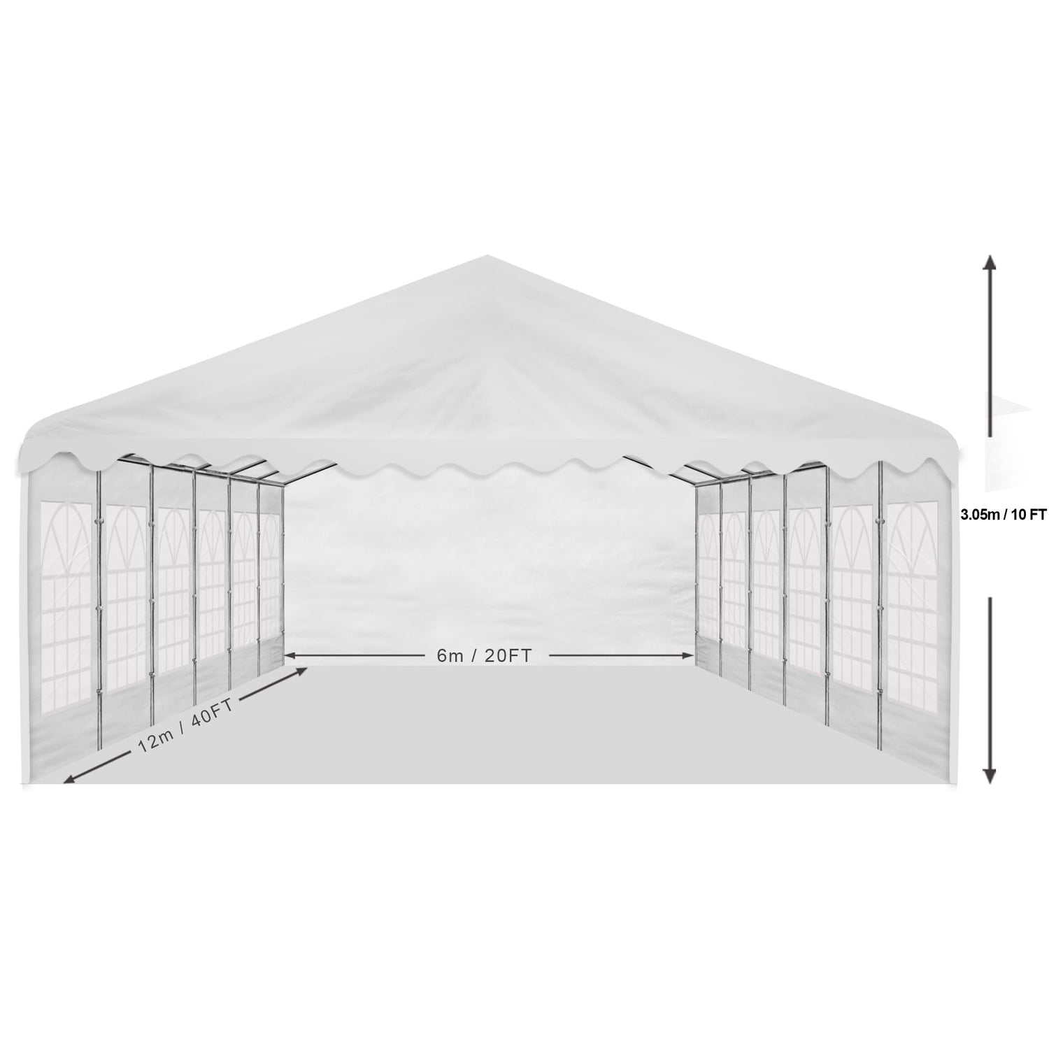 Size: 40'L(12m)x20'W(6m)x10'H(3.05m peak);6.6'H(2m side)