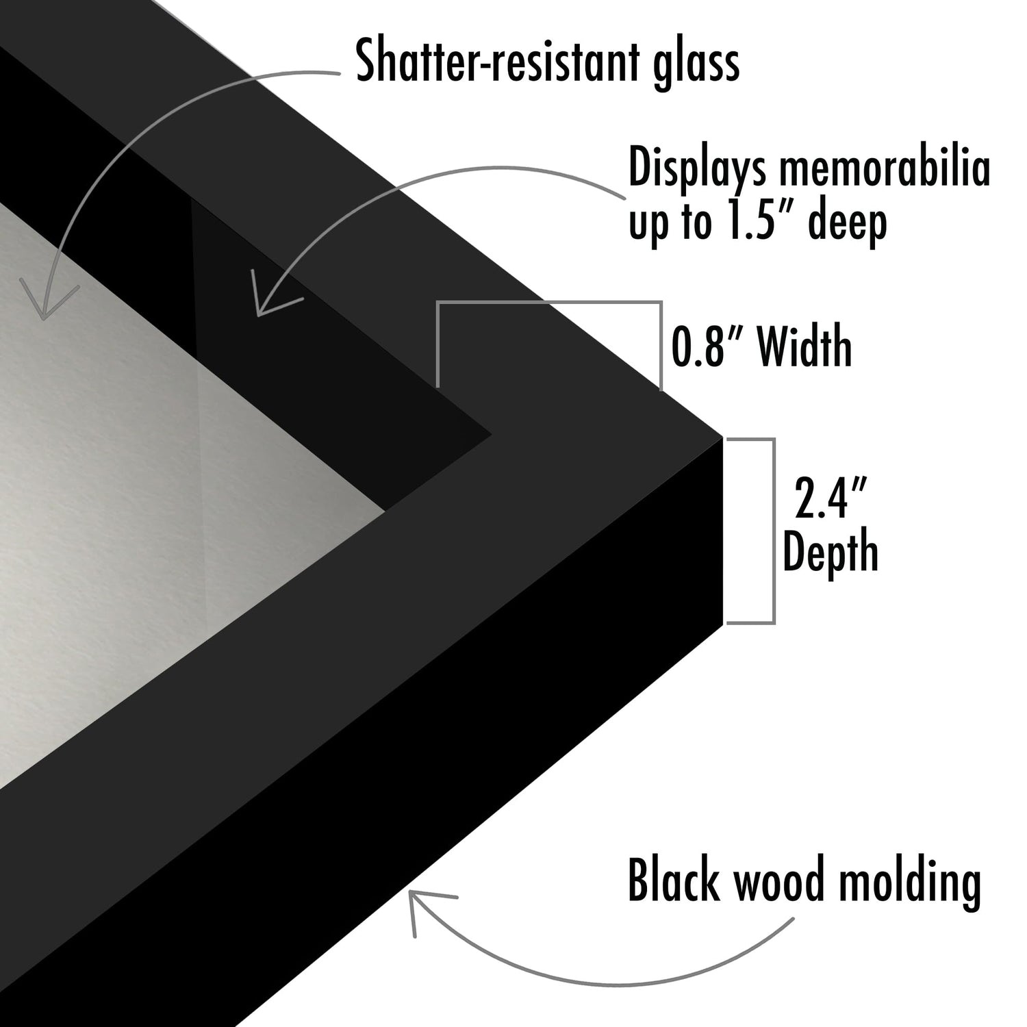 Details: Give your memories the frame they deserve with the Americanflat 11x14 shadow box frame. Crafted from durable engineered wood (MDF) in a classic black finish and featuring a soft felt back, our shadow box is the perfect way to showcase your cherished moments and favorite treasures. Whether it’s a family photo, an award, or a special memento, this frame adds just the right amount of style. The deep 1.5-inch interior depth provides ample space to safely store and protect your prized possessions, while the 2.4-inch exterior depth is ideal for displaying on a tabletop, offering plenty of room for your items to stand out. It even comes with pins, so you can easily secure keepsakes, medals, and more. And when you’re ready to take it to the wall, simply use the included hanging hardware for an easy vertical or horizontal display option. From photos to memorabilia, these shadow box display cases adapt to your needs, adding a timeless touch to any room. The box molding and polished finish enhance your display, creating an elegant piece that complements any home or office decor. Not only does it look great, but it’s built to last. With a shatter-resistant glass front for crystal-clear visibility and easy-to-use turn buttons for hassle-free updates, this shadowbox picture frame keeps your memories secure and beautifully displayed for years to come. The sturdy backboard ensures everything stays in place, no matter what you choose to showcase. Why settle for an ordinary frame when you can have a deep shadow box frame that adds both style and security? Order yours today and join thousands of satisfied customers who’ve transformed their spaces with Americanflat.