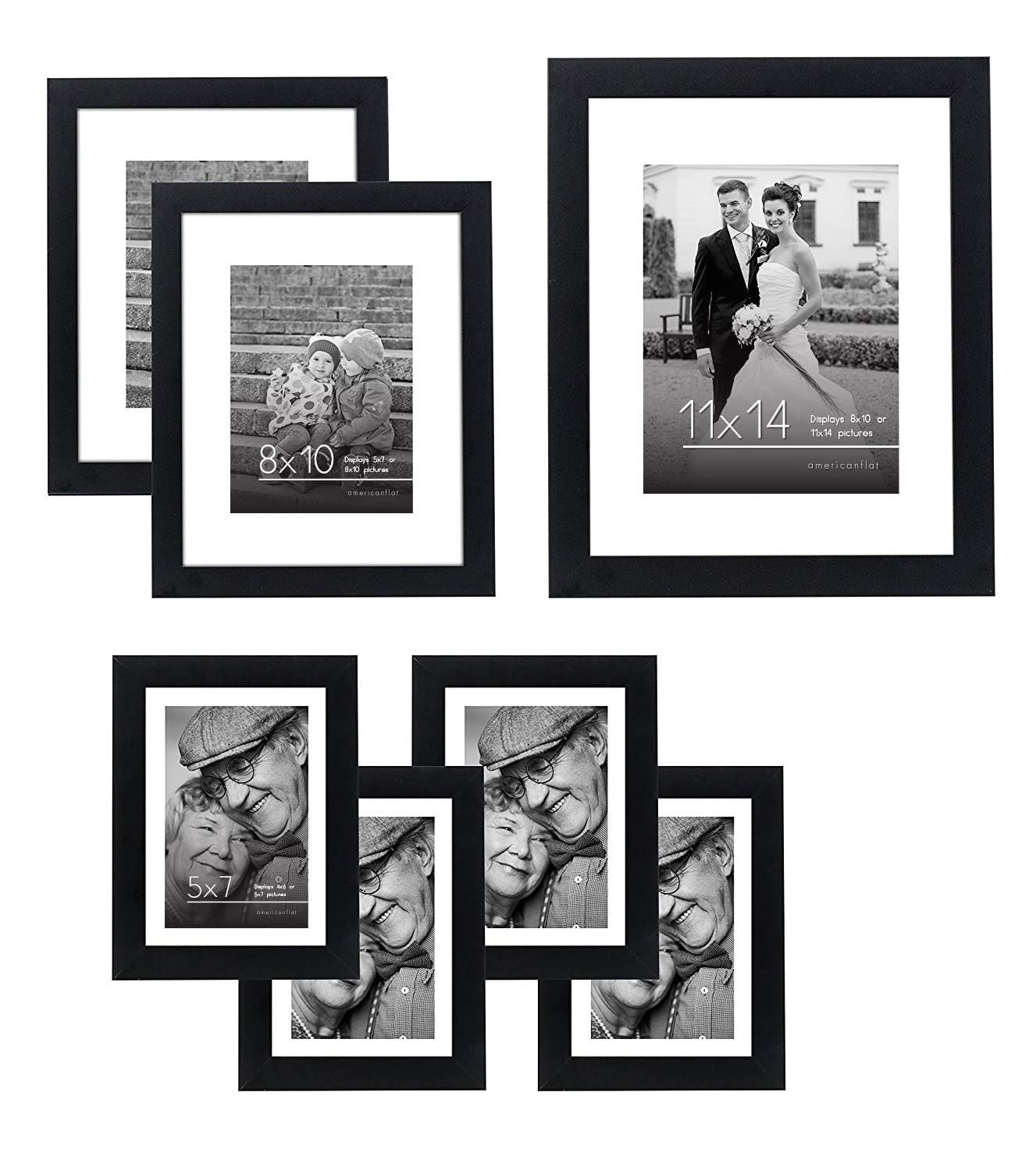 - Design: Black 7-piece gallery wall frame set that includes one 11x14 frame, two 8x10 frames, and four 5x7 frames. With white beveled mats and hanging hardware for easy wall display, the 8x10 and 5x7 frames include easel stands for tabletop display.