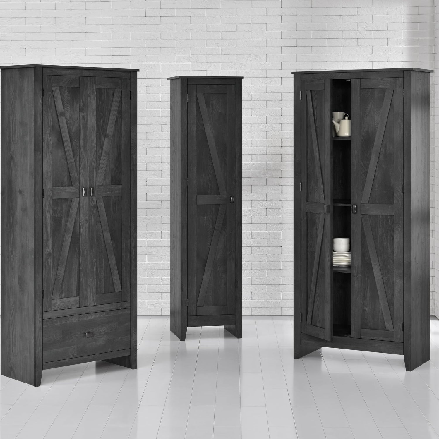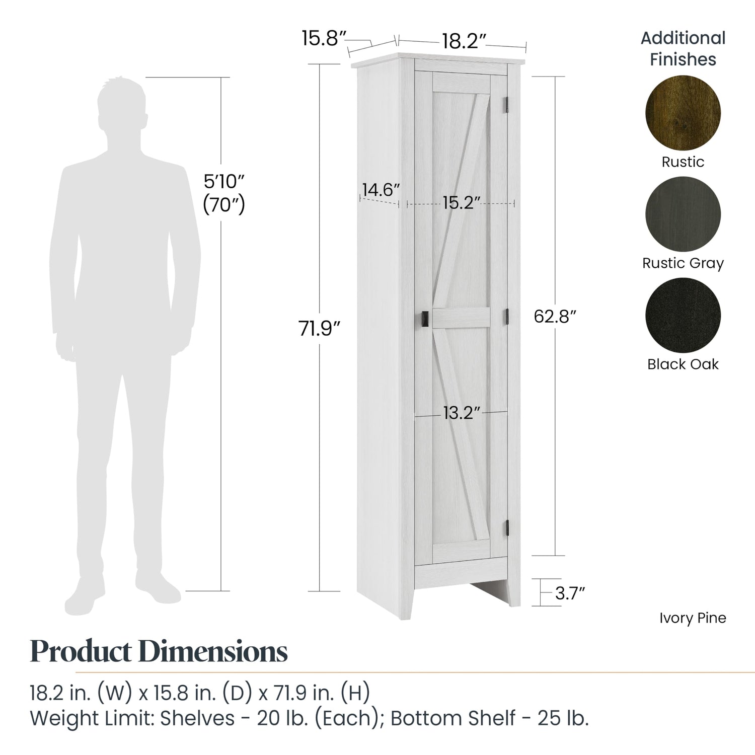 Details: The Systembuild Evolution Farmington 18" Wide Storage Cabinet is a stylish way to stay on top of your organization. The rustic barn style design and sleek tapered feet gives the look of an old weathered cabinet but the sturdy laminated particleboard and MDF make this cabinet the perfect piece to house your home office supplies, extra linens, nonperishable food and more! Open up the door to 4 spacious shelves, 2 adjustable, to fit items of differing sizes. The weathered brown finish with gray undertones will bring a nice rustic appeal to your space. The Farmington Cabinet is recommended to be assembled and moved by 2 adults. A wall anchor kit is provided for extra safety and security. After assembled, this cabinet measures to be 71.9"H x 18.2"W x 15.8"D.