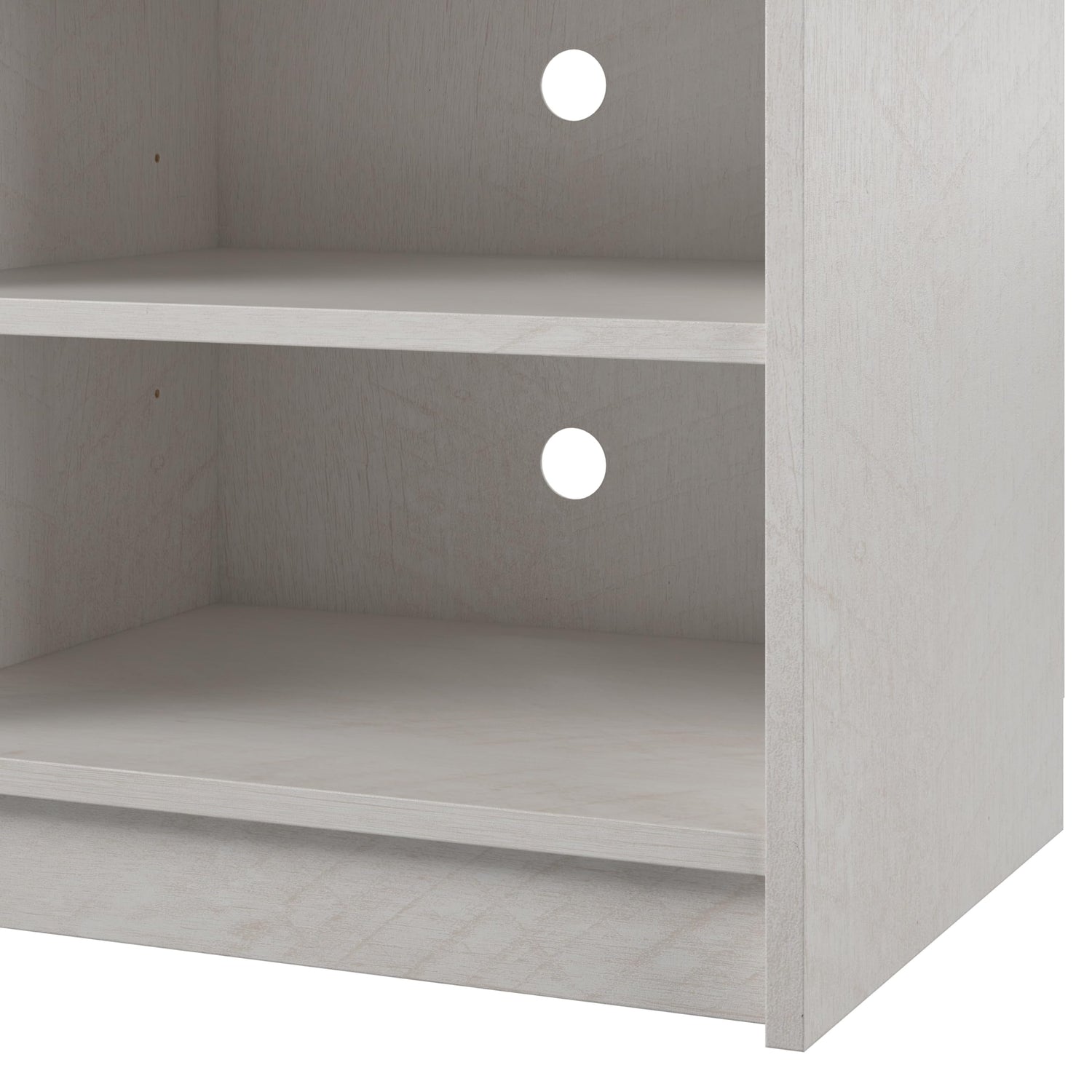 - The TV Stand ships flat and requires assembly. Two adults are recommended to assemble. Assembled Dimensions: 58" W x 16.06" D x 23.23" H. Each shelf can hold up to 15 lbs. Assembled unit weight is 84 lbs.