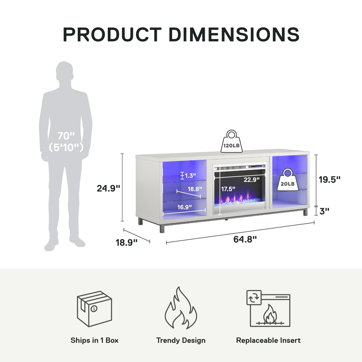 Details: Step away from the ordinary and give your living room a modern makeover with the Ameriwood Home Lumina Fireplace TV Stand. Ready to warm up a 400 square foot room with the touch of a button, you can relax knowing that timers will take care of the rest. If you want to simply enjoy the look of the flames without the heat use the included remote to switch off the heat option and pick your flame brightness. On either side of the fireplace insert are three shelves, 2 glass, that hold your entertainment components like gaming systems, a DVD player, remotes and more. Both of the side shelves are illuminated with blue lights to coordinate with the glowing fireplace. The top can hold up to a 70" flat paneled TV with a maximum weight of 120 lbs. Two adults are recommended to assemble this Fireplace TV Stand. After assembly, the stand measures to be 24.875"H x 64.75"W x 18.875"D.