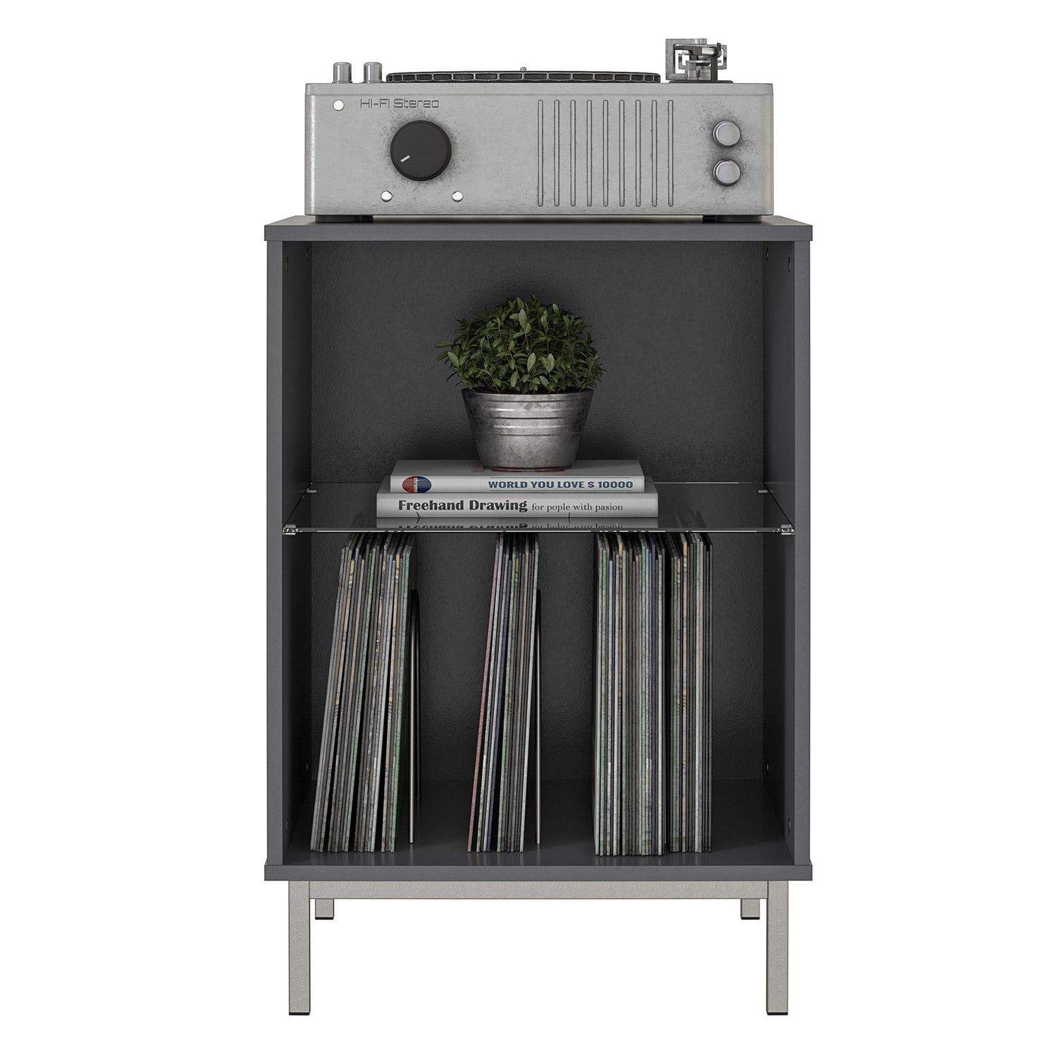 - The glass shelf and metal record dividers provide plenty of space to keep your albums organized