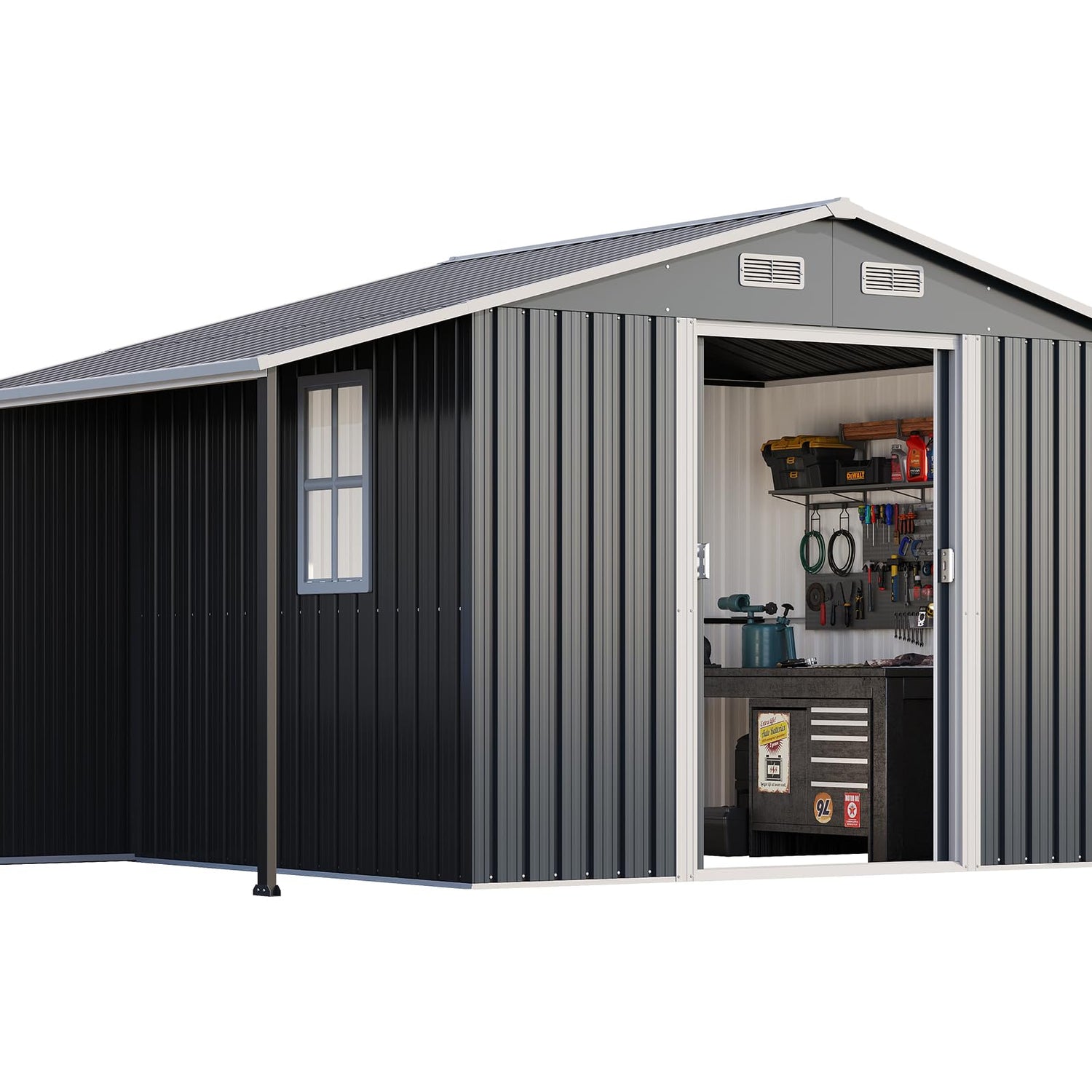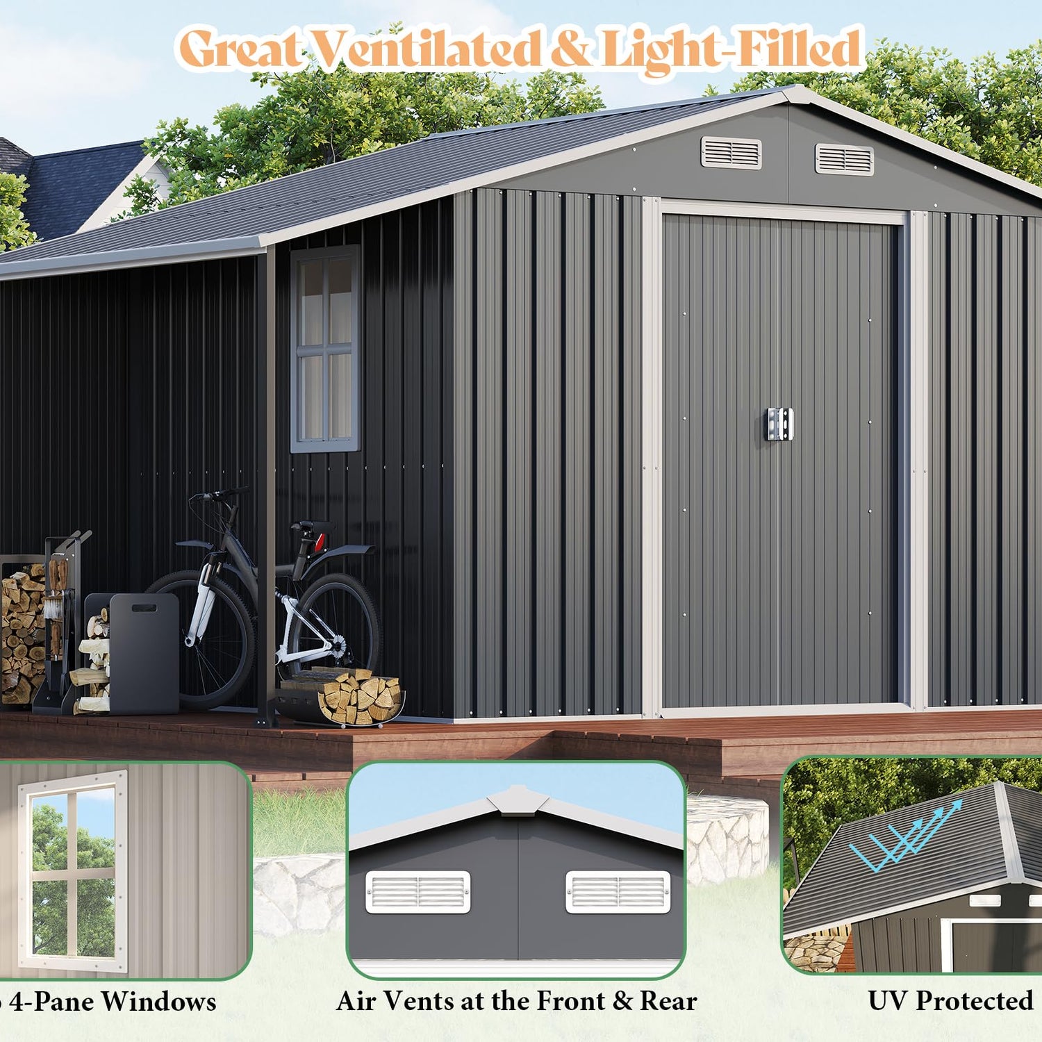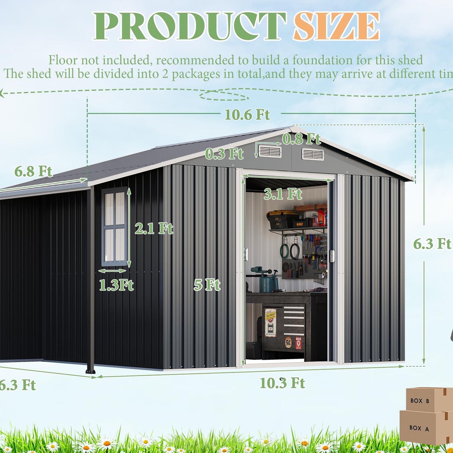 AMERLIFE 10.6x6.8x6.3 FT Galvanized Metal Storage Shed with Open Firewood Bay, Sliding Doors & Ramp, 2 Windows & Vents, Weather-Resistant Outdoor Tool/Garden Shed, Dark Gray
