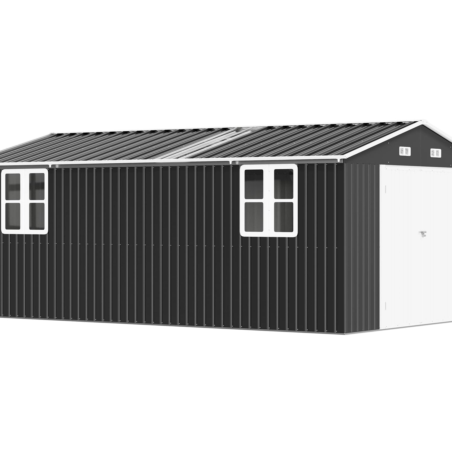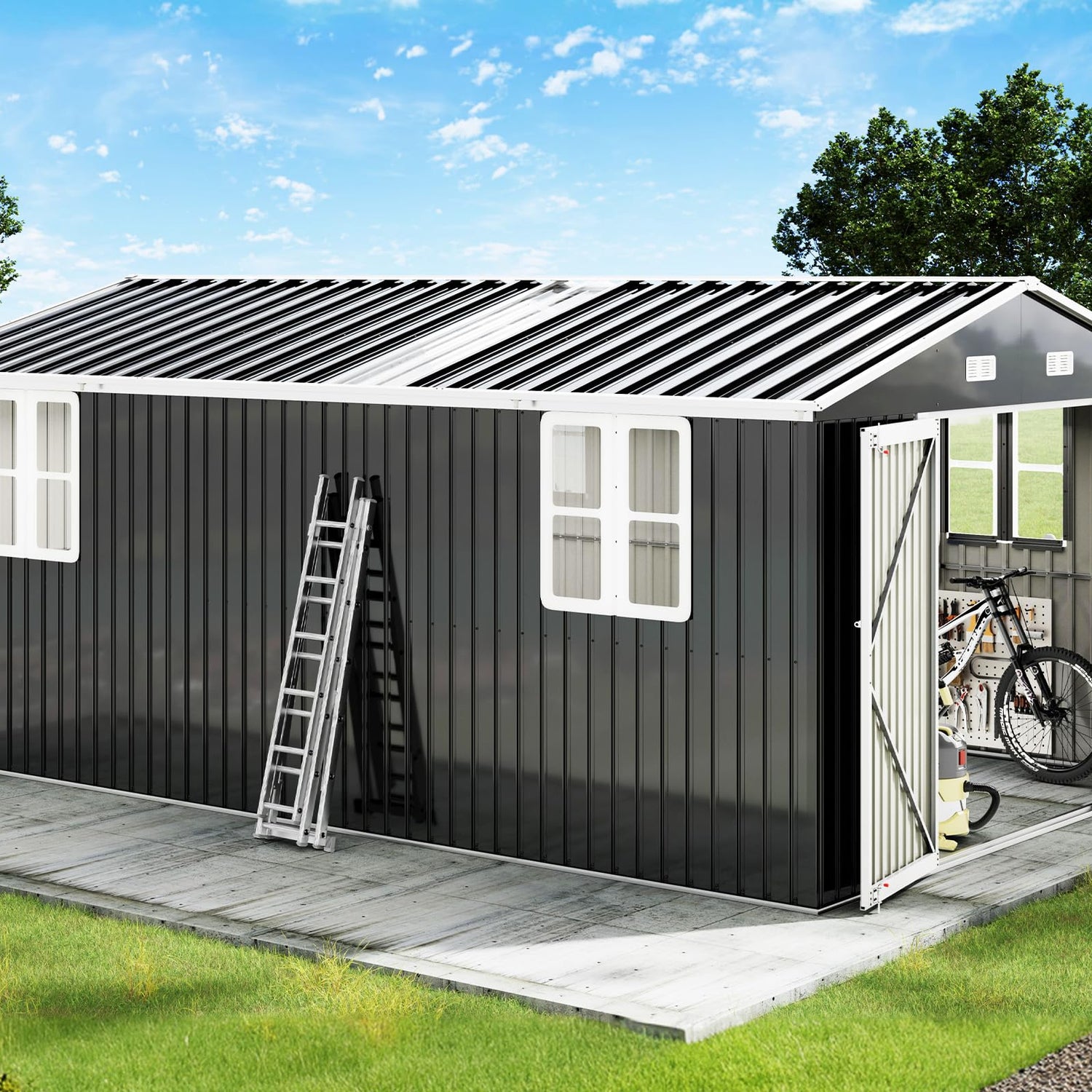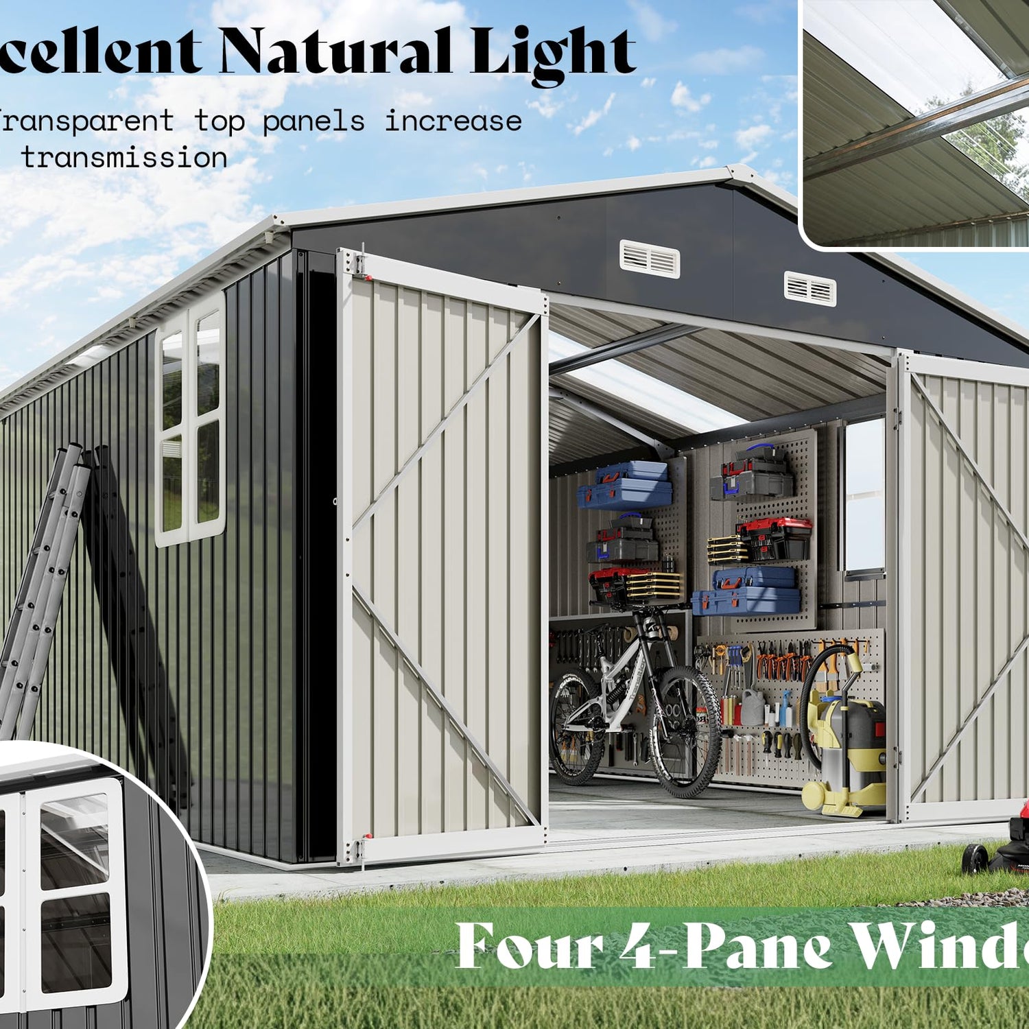 AMERLIFE 10x16x7.2 FT Metal Storage Shed with 2 Transparent Panels, Outdoor Tool Shed with Hinged Double Doors, Windows & Vents, Reinforced Steel Frame for Backyard Garden, DIY Workshop, Dark Gray