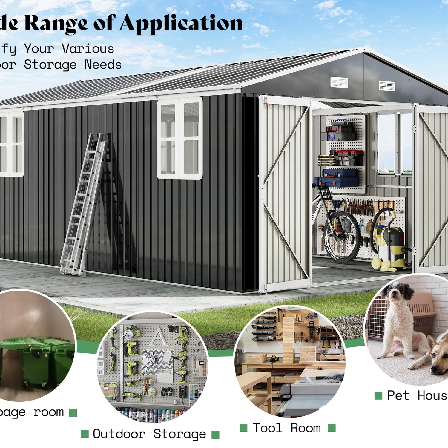 - Well-Ventilated & Easy Access: Equipped with 4 vent windows and wide double doors, airflow is optimized to prevent dampness. Move in and out easily with large tools, carts, or bikes in your garden shed