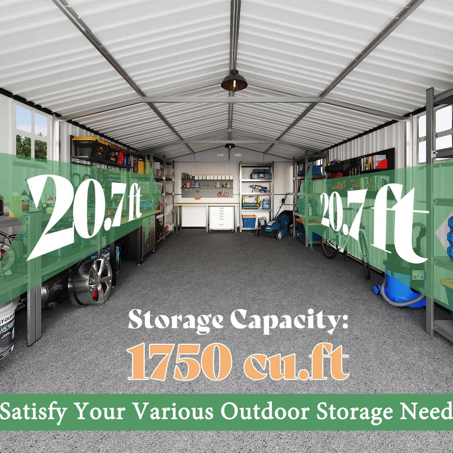 - 13.2x21x8.4 FT Extra Huge Storage Shed: This shed offers an impressive 1750 cu.ft of storage space, perfect for accommodating cars, large tools, and equipment. Recommended to build a 14x22 FT foundation for it