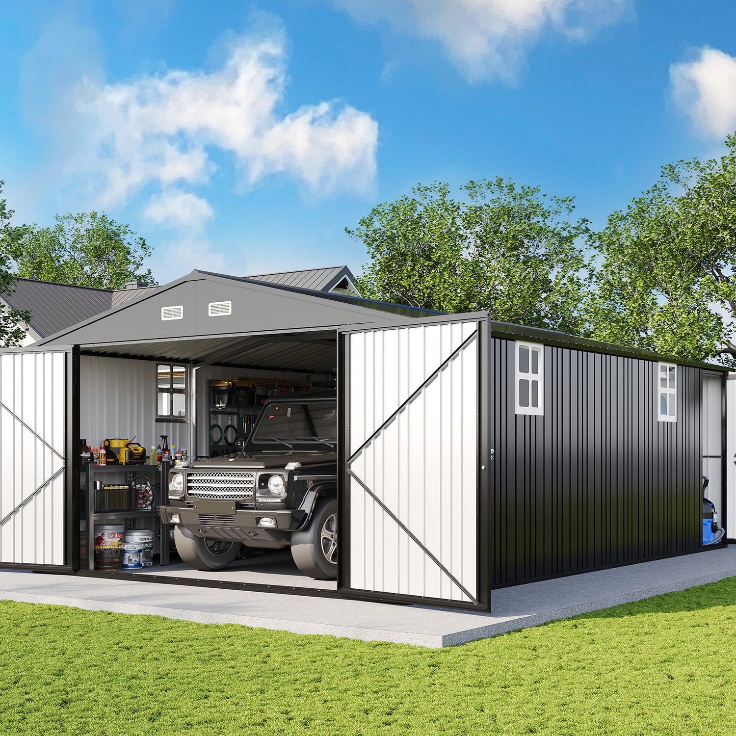 - 2-Doors Design: The car shed with front hinged door and side door, you can drive in or walk into the shed so easy. Upgraded 6.6 FT wall and door height, easy to access, and no need to bend over