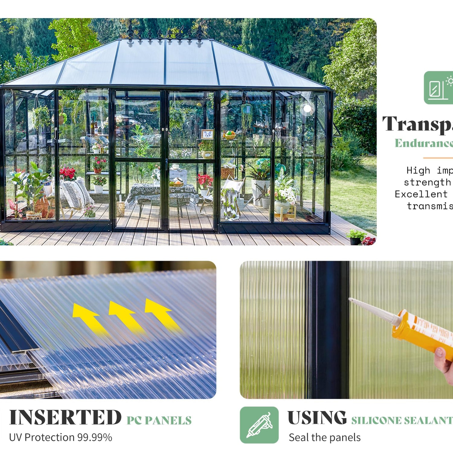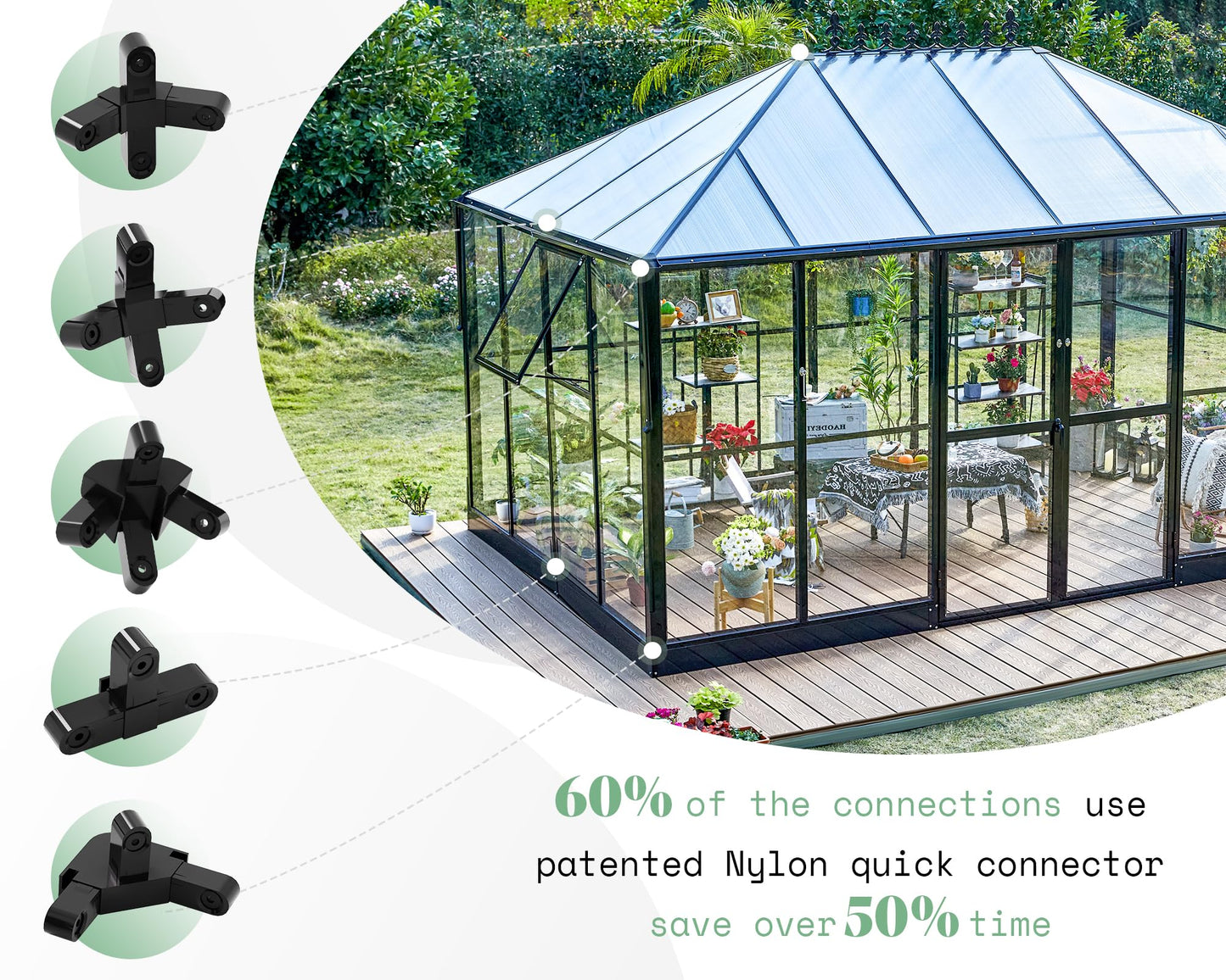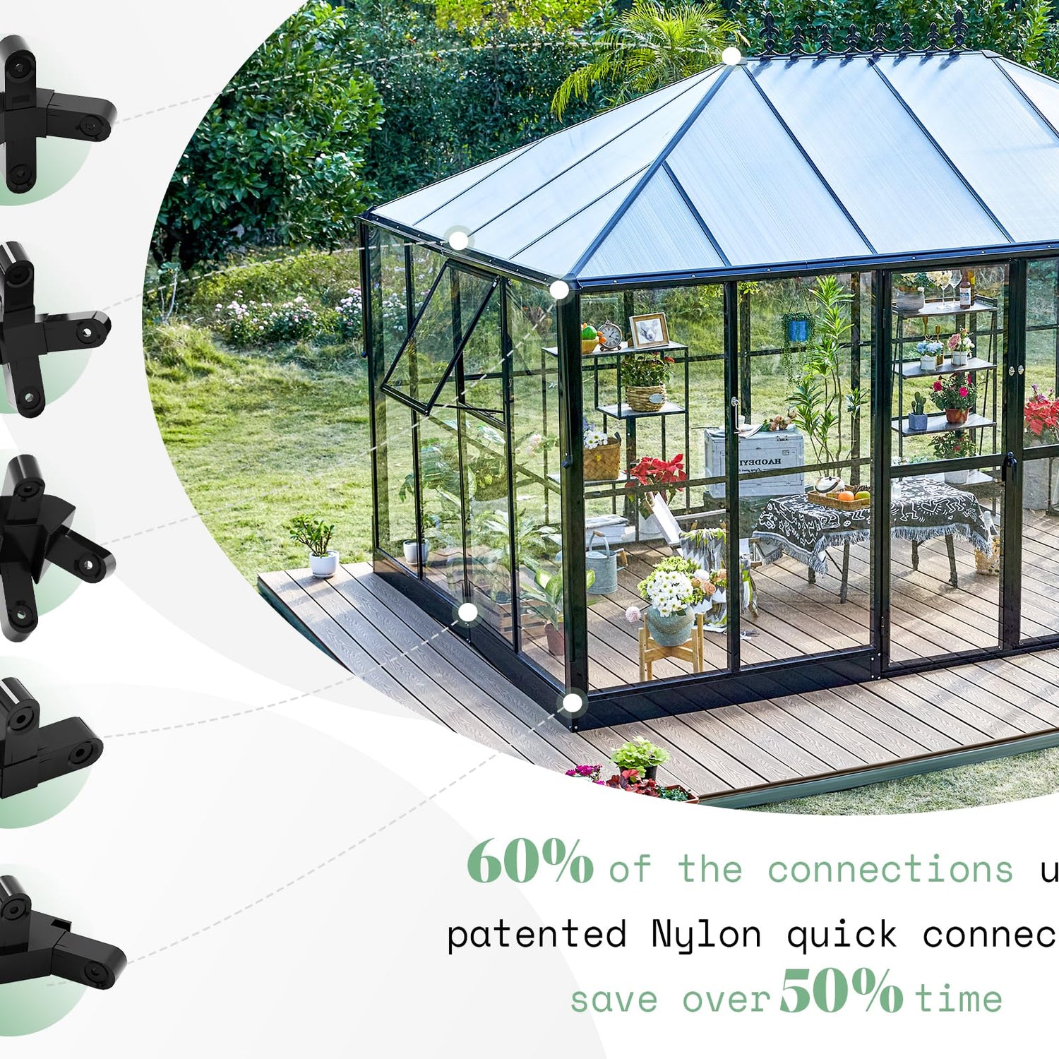 AMERLIFE 14x9.5x9 FT Hybrid Polycarbonate Greenhouse Quick Connector Fast Assembly, Swing 2 Doors Clear Panels, Walk-in Large Aluminum Greenhouse Winter Greenhouse for Outdoors, Black