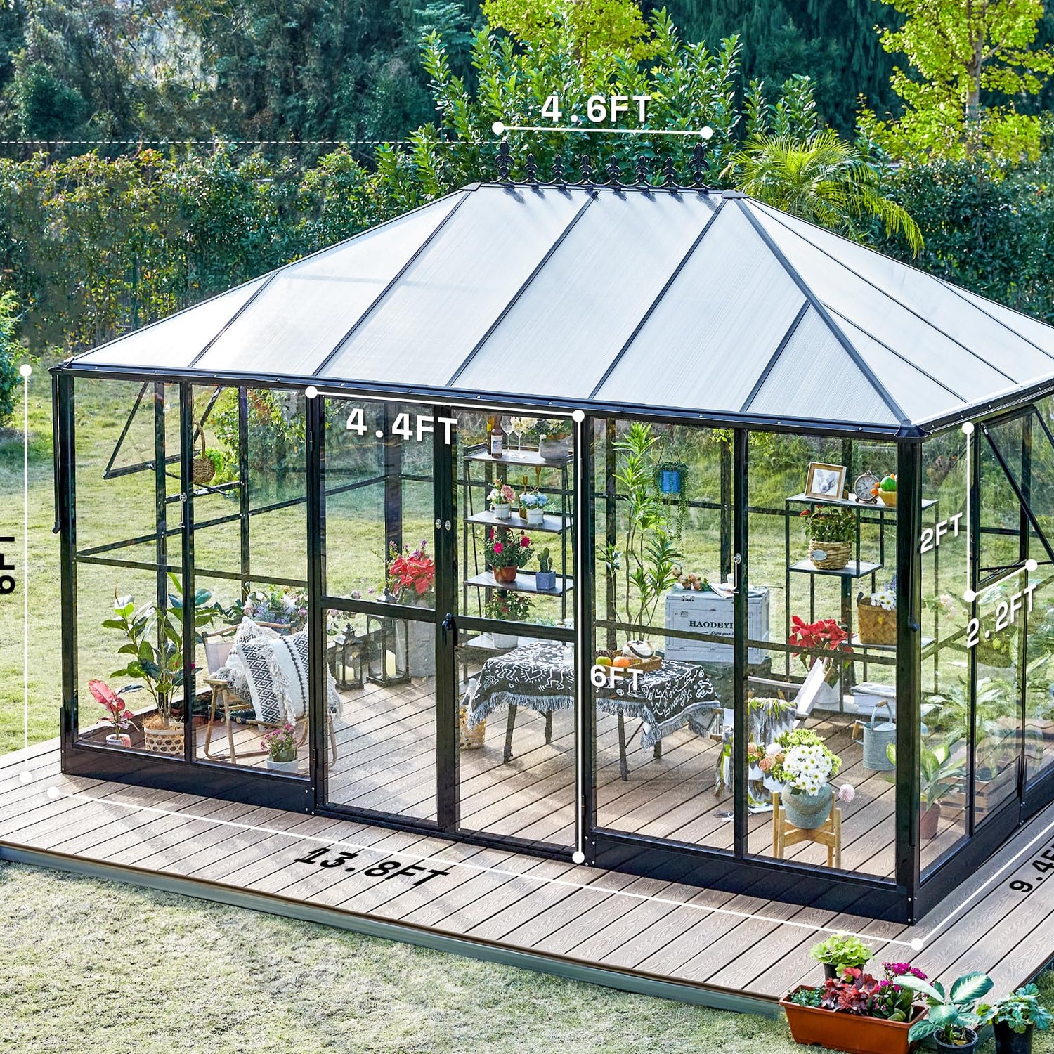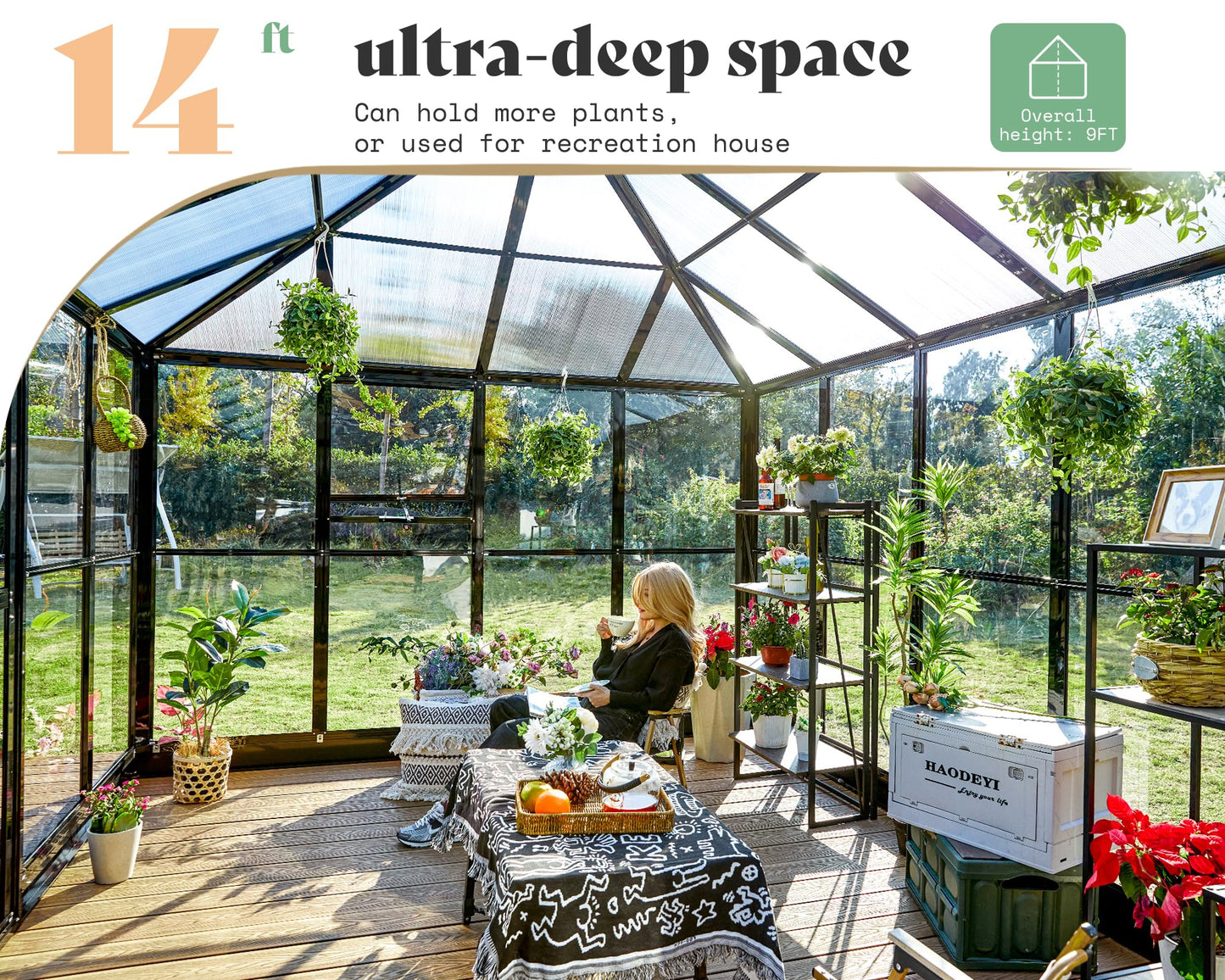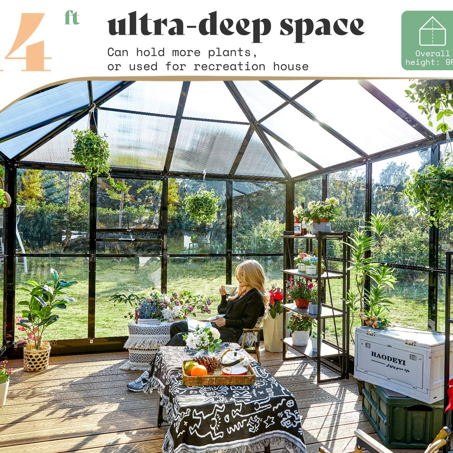 - 14x9.5FT Hobby Greenhouse & Sunroom: Anti-rust aluminum frame (1.5mm) Overall height: 9 FT, extra large space accommodating more plants, or used for recreation house, without the feeling of being cramped. Upgraded 6 FT wall height, easy to access, and no need to bend over