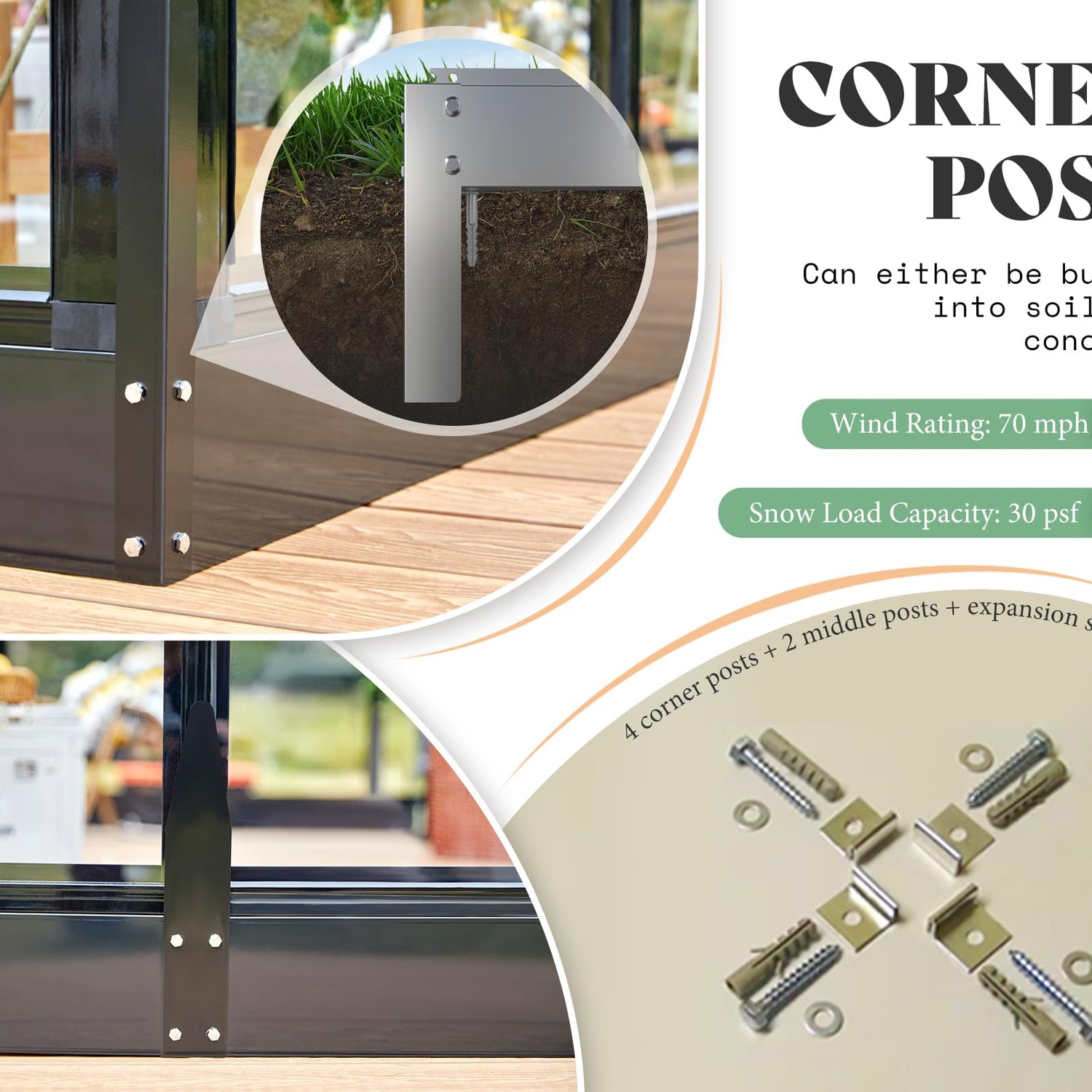 - Windproof Firmware: Anti-rust aluminum frame (1.5mm), 4 corner posts & 2 middle posts, with reinforced expansion screws, help bury the winter greenhouse kit deeply in the soil, concrete or wooden floors for extra stability. Wind Rating: 70 mph; Snow Load Capacity:30 psf