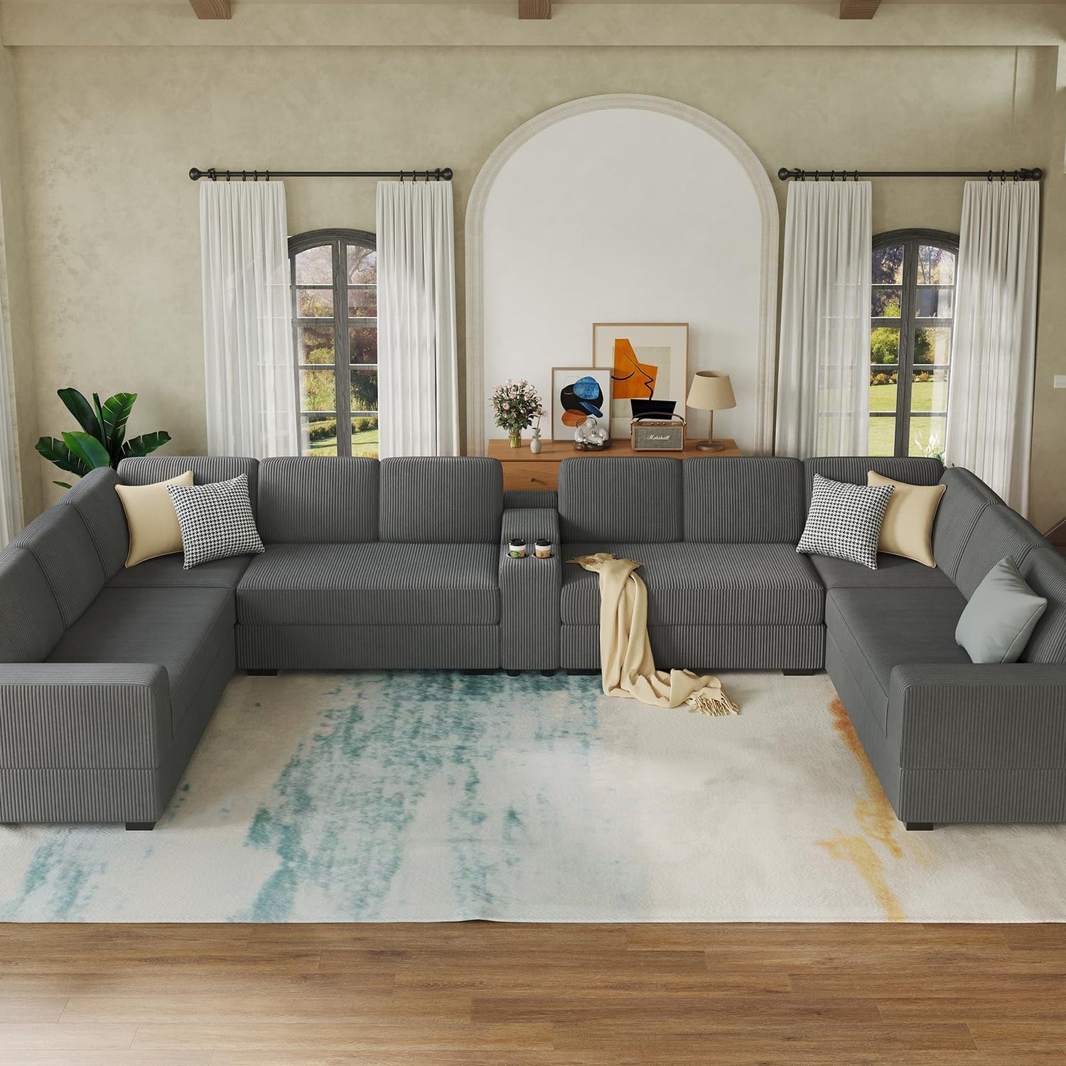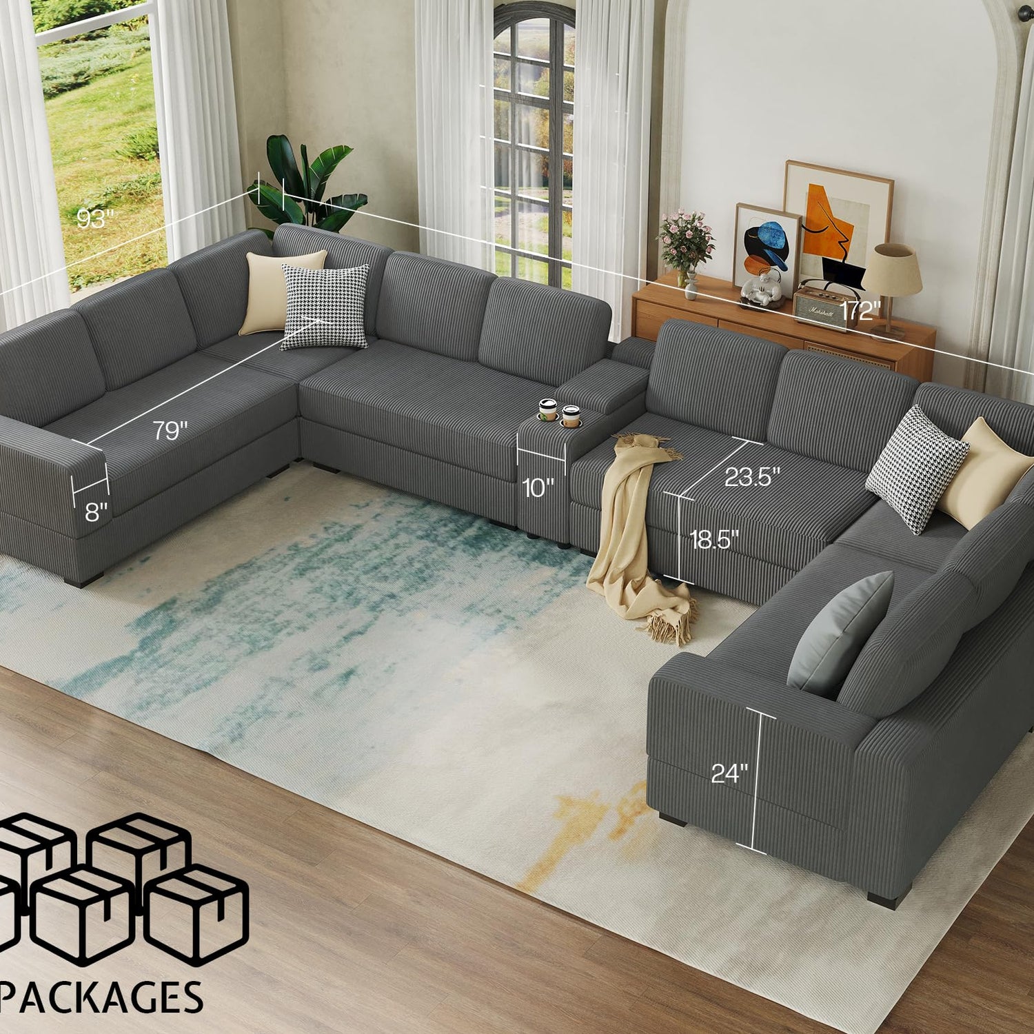 AMERLIFE 172 Inch U Shaped Couch, Modular Sectional Sofa with Storage Console, Oversized Couch with Charging Socket, Grey Comfy Couch