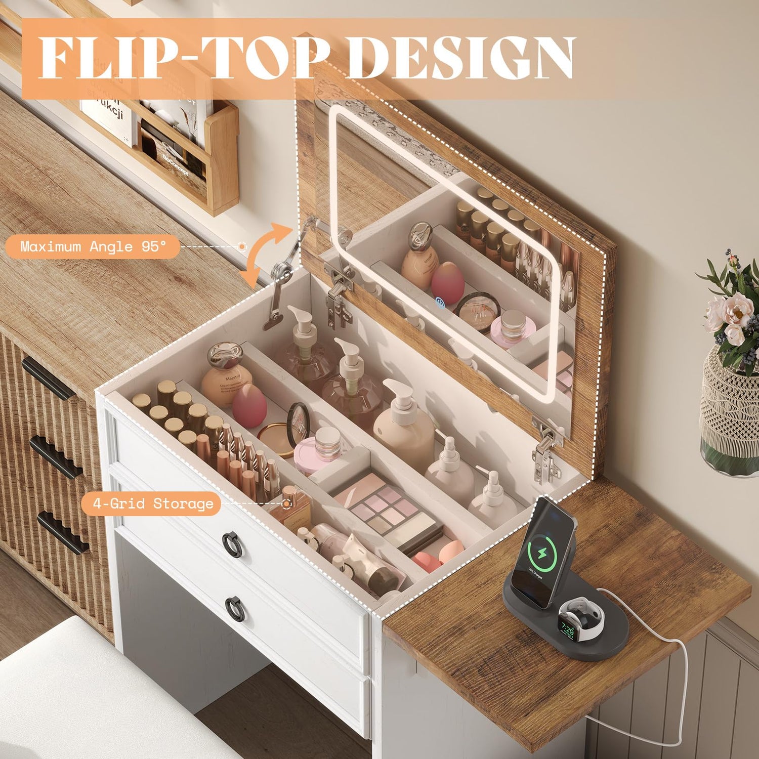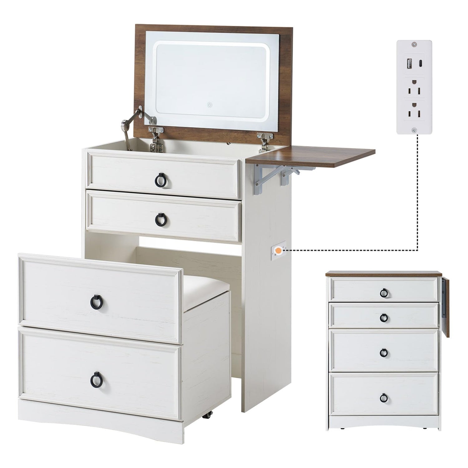 - [Versatile 3-in-1] Transform your space with our vanity table set that serves as a vanity, nightstand, and storage unit. When closed, it's a compact dresser; pull out the chair and flip up the top panel for a functional vanity. Ideal for small spaces