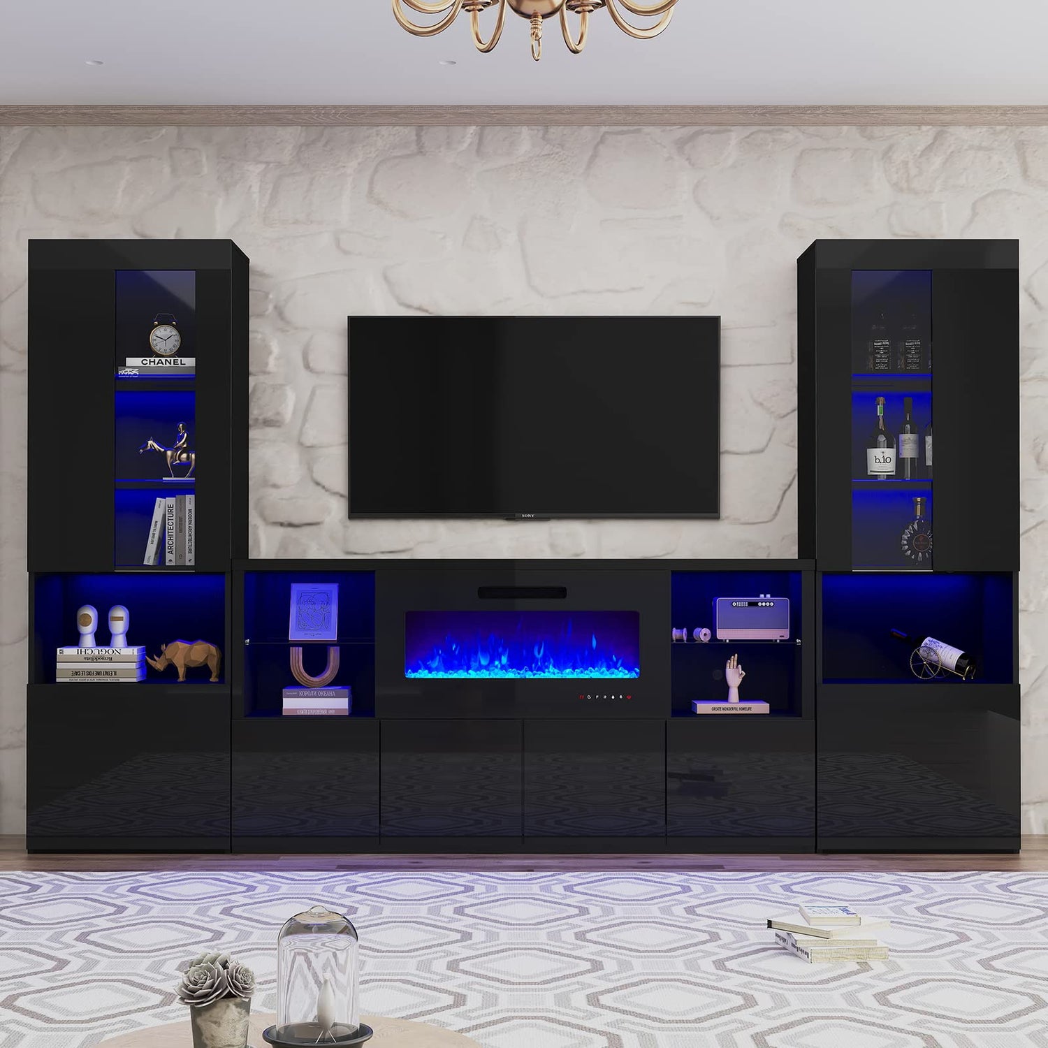 AMERLIFE 3 Piece Modern High Gloss Fireplace TV Stand + Bookcase Set for Living Room Includes 68" TV Stand with 40" Fireplace, 2 X Bookcase Storage Cabinet with Doors & 20 Colors LED Lights, Black