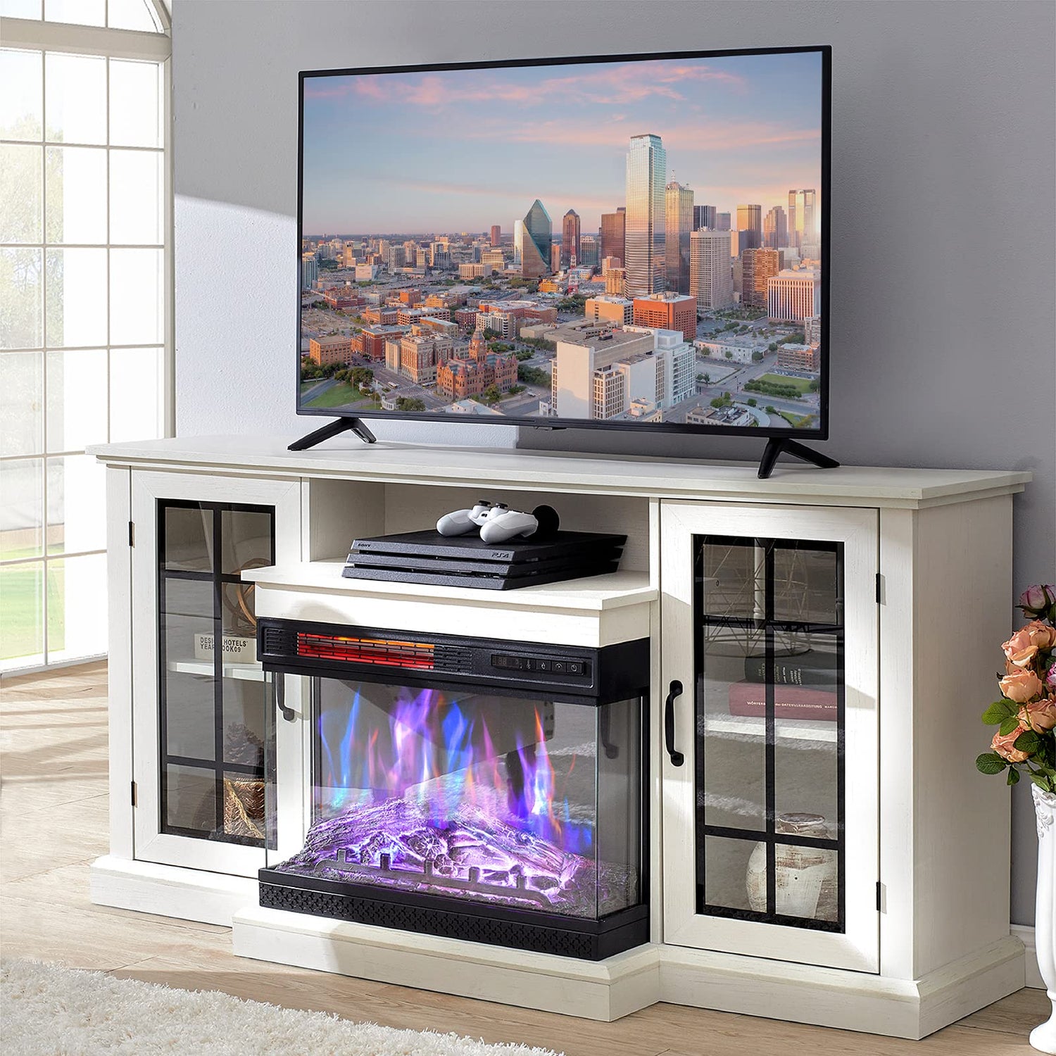 AMERLIFE 3-Sided Glass Fireplace TV Stand for TVs up to 65'' with 12 Color, Media Entertainment Center Console Table with Doors Closed Storage, Distressed White