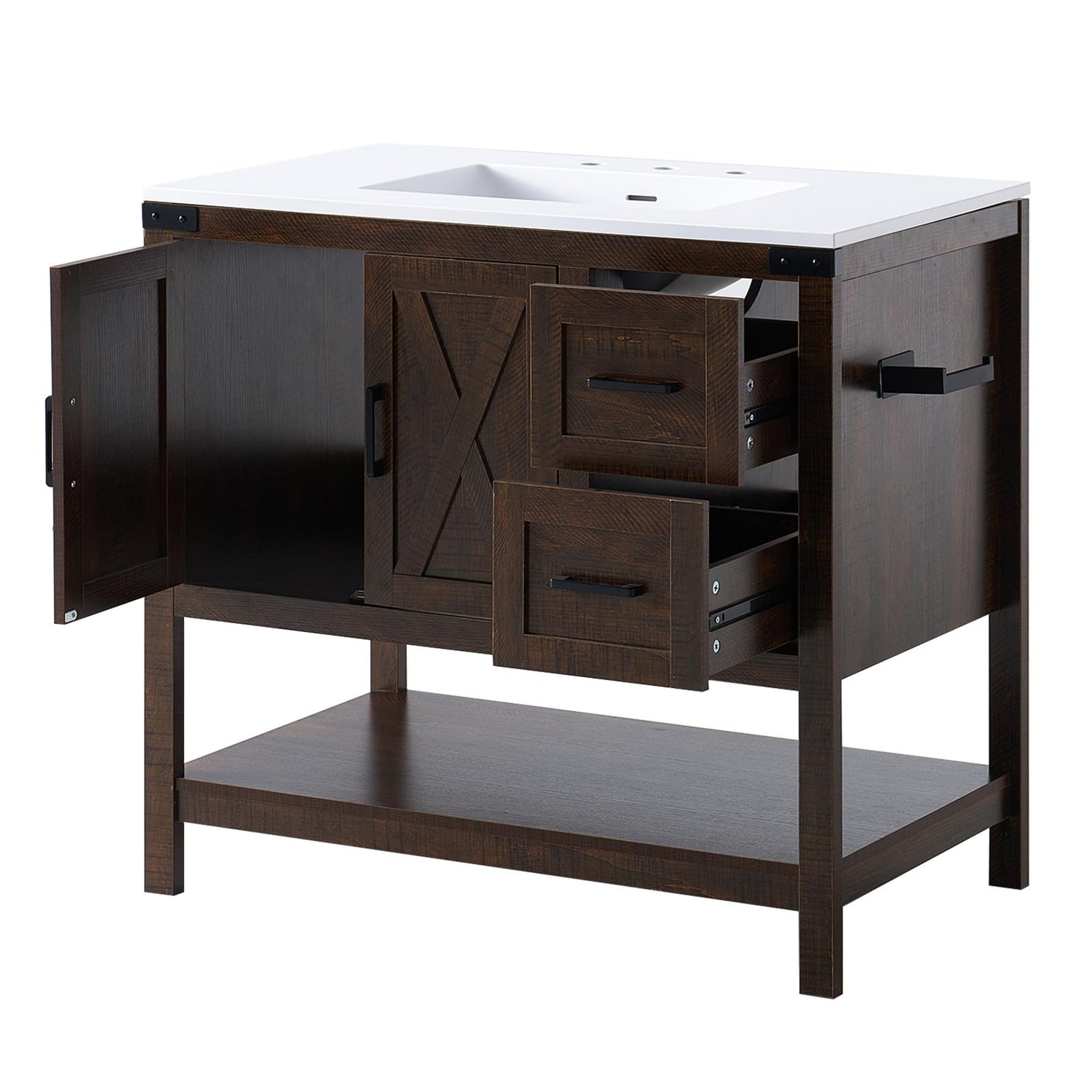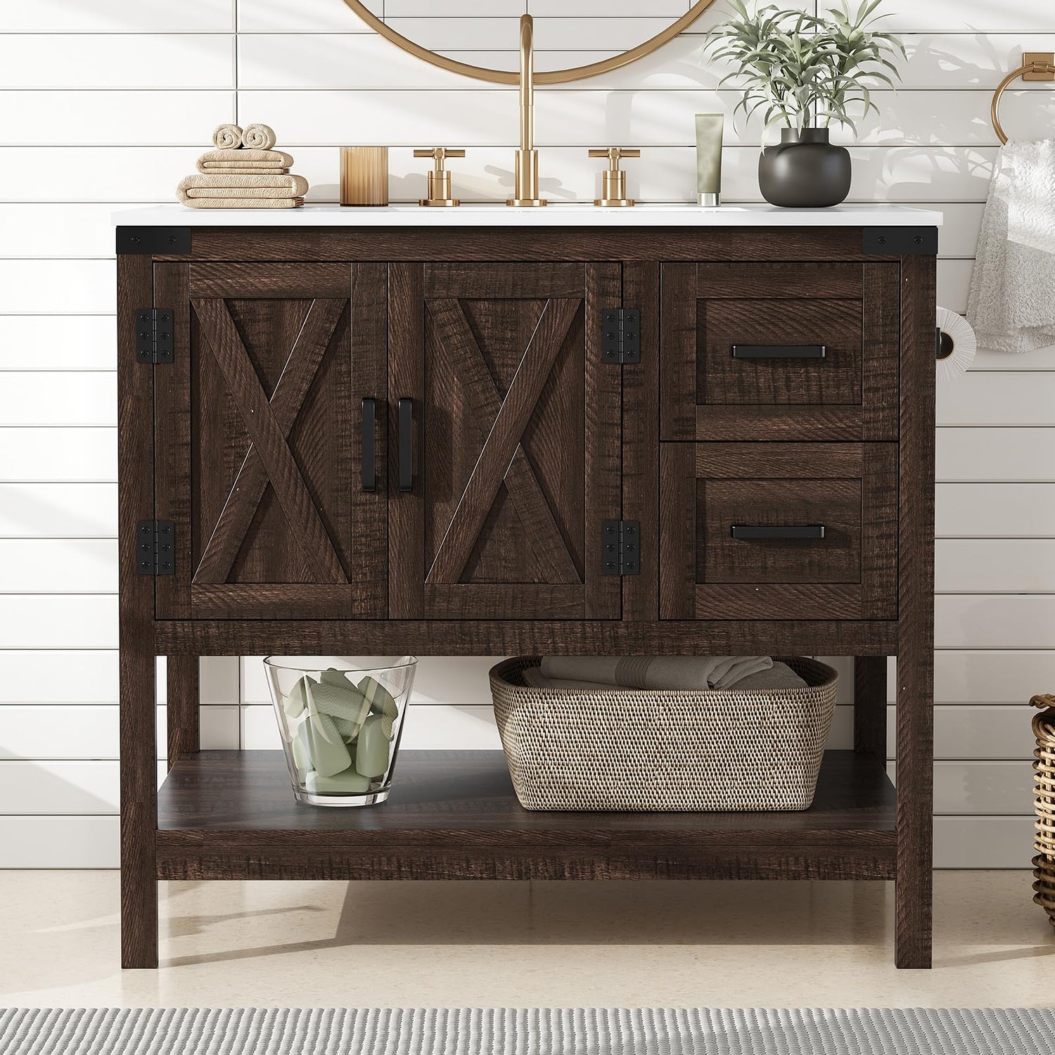 AMERLIFE 36" Farmhouse Bathroom Vanity with Sink Combo, Freestanding Small Single Wood Barn Door Bath Storage Cabinet Set with Sliding Drawers & Open Shelf, Paper Towel Holder, Rustic Brown