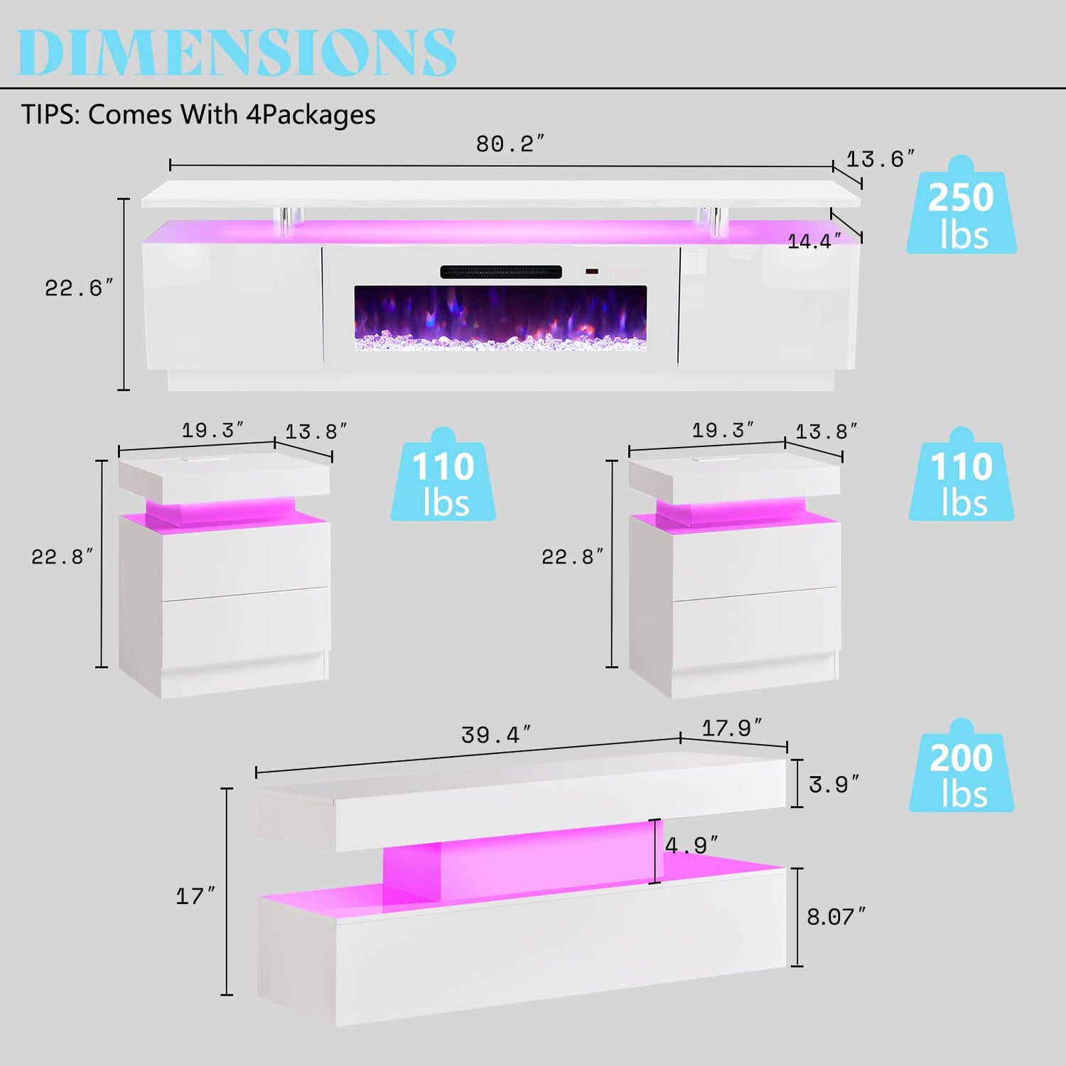 - Dimensions: TV Stand: 80"W x 14"D x 23" H, weight capacity 250lb, Fireplace: 40"W, 1400W power heat room size up to 400 sq. ft. can work with or without heat. Coffee Table: 39.4"Wx17.9"Dx16.9"H, Night Stand: 19.3"Wx13.8"Dx22.8"H