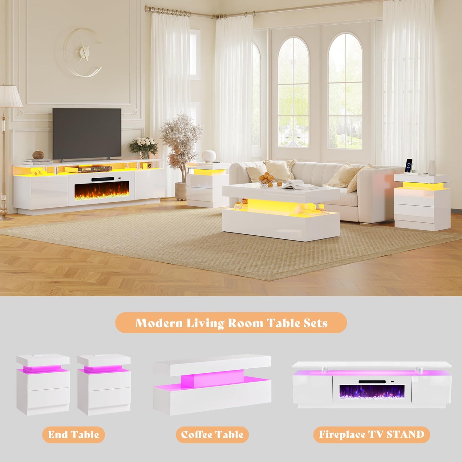 AMERLIFE 5 Piece Modern Living Room Table Set, Includes 80" Fireplace TV Stand, 2-Tier Coffee Table, 2 X Side Tables with Charging Station, LED Media Furniture, White