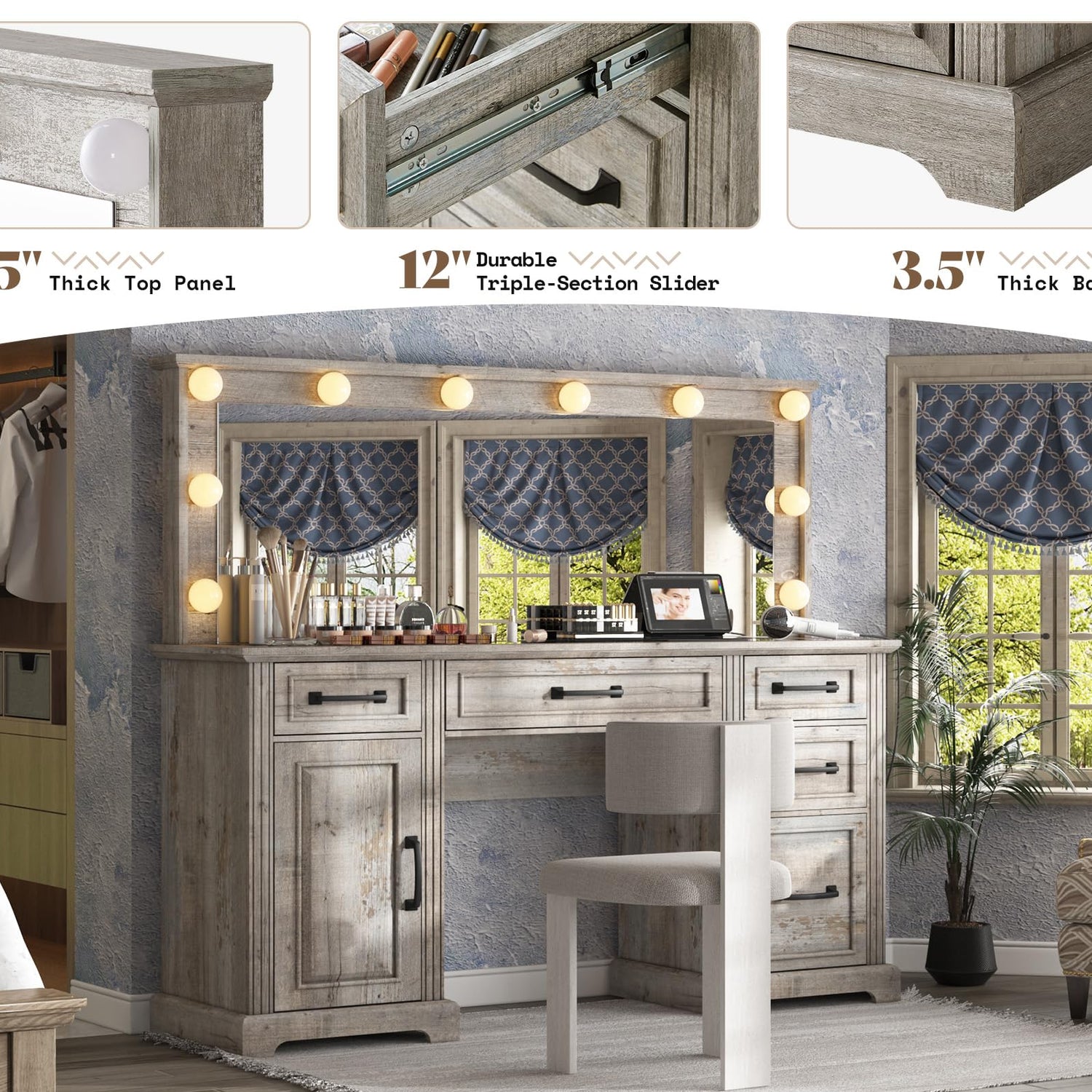 AMERLIFE 55.1" W Makeup Vanity with Hollywood Mirror, Glass Top Vanity with 5 Drawers & Adjustable Cabinet & Charging Station, 10 Detachable Light Bulbs, Bedroom/Salons, Light Oak