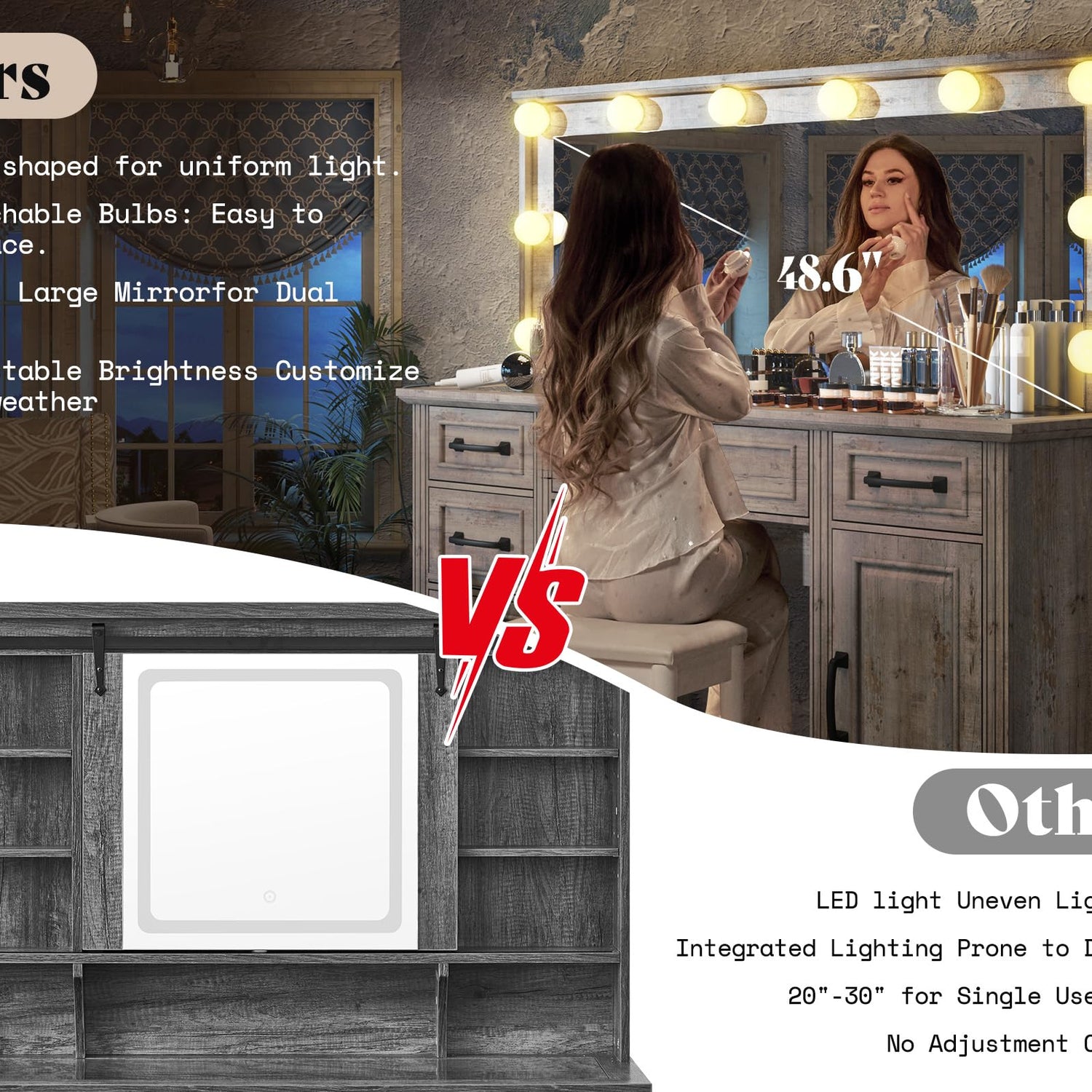 • [Spacious 55" W Design] The vanity desk with 10 independent global-style bulbs features an extra-wide 55" design, perfect for accommodating two people simultaneously. The 48" x 20.3" HD tempered glass mirror ensures a crystal-clear reflection, enhancing your makeup application experience