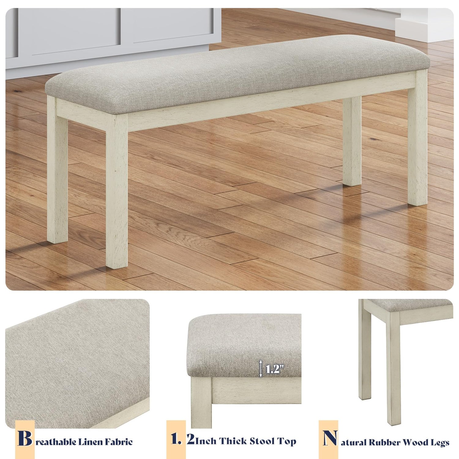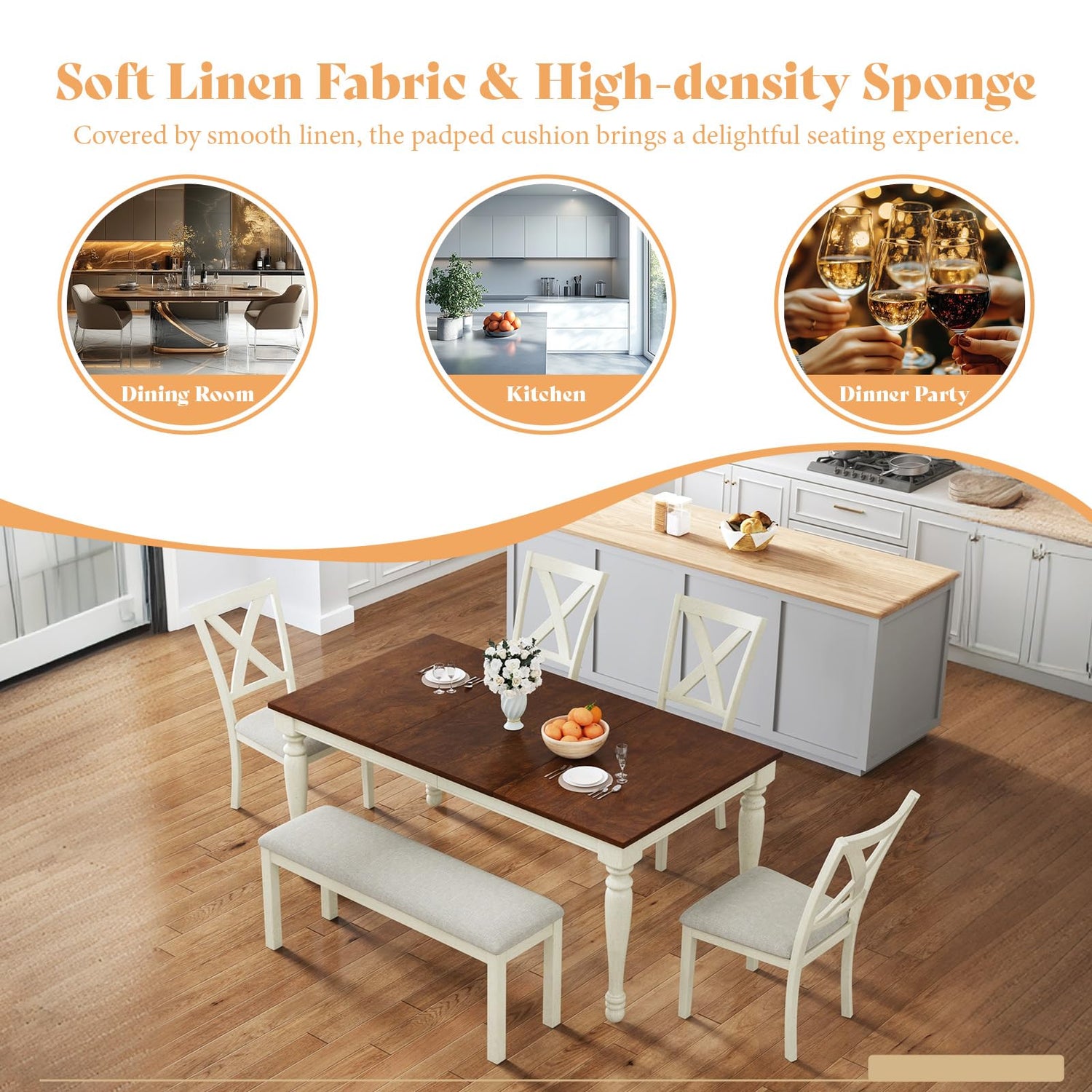AMERLIFE 6-Piece Farmhouse Dining Table Set with 4 Upholstered Chairs and Bench, 71” Solid Wood Table, Seating for 6, for Dining Room or Kitchen, Rustic White & Walnut Finish