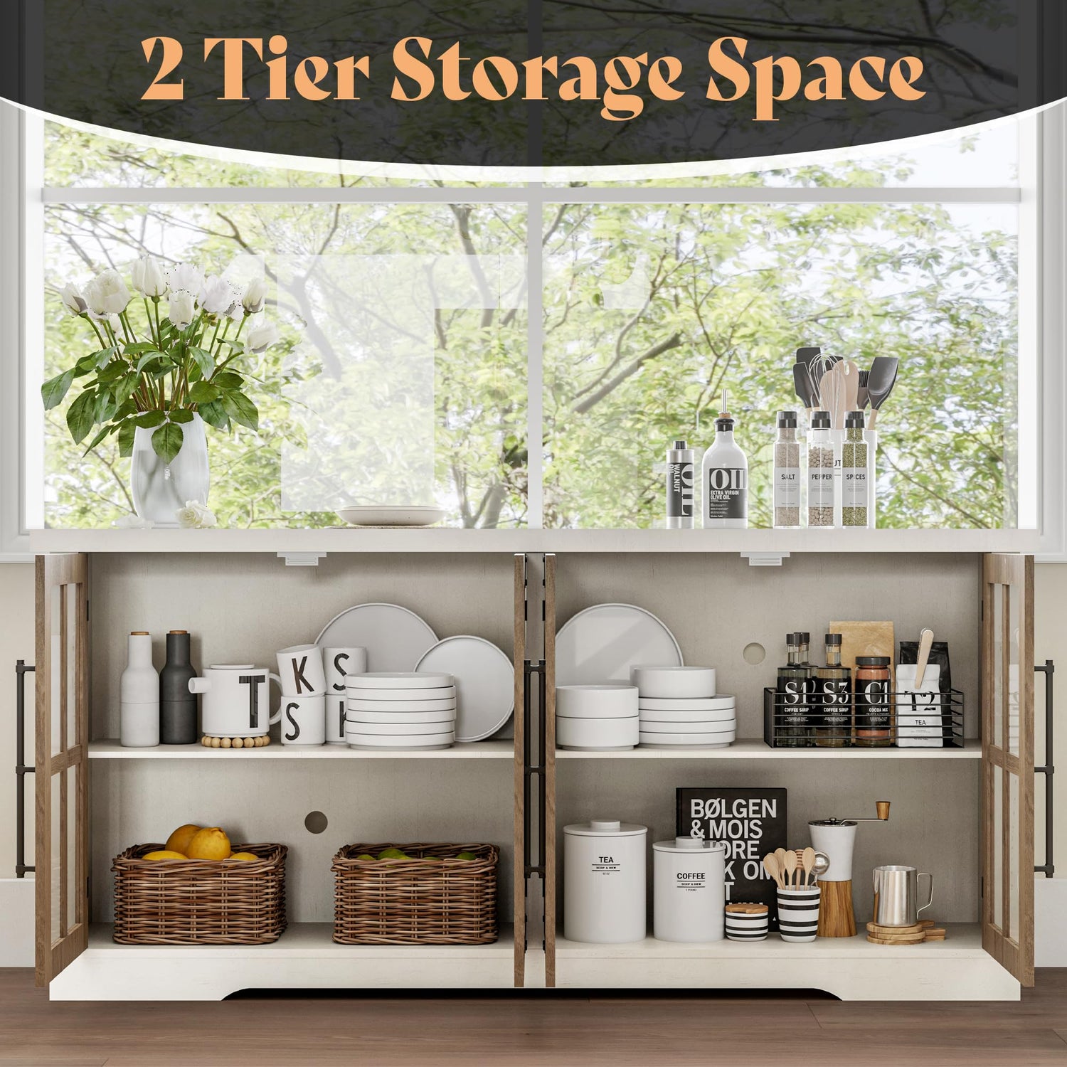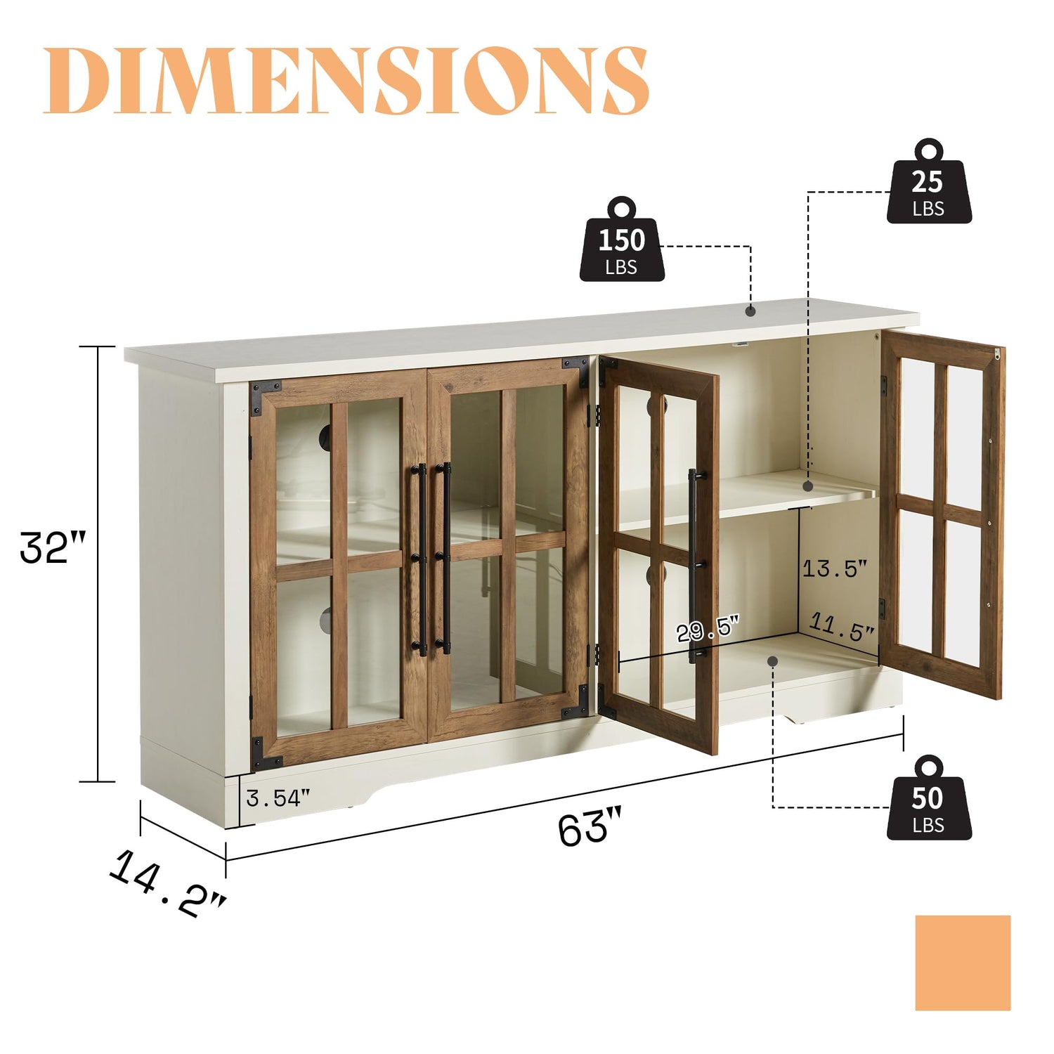AMERLIFE 63" Buffet Sideboard Cabinet with Storage, Modern Farmhouse Cabinet with 4 Glass Doors & Adjustable Shelf, Wood Buffet Table Cabinet for Kitchen Dining Room Living Room, White