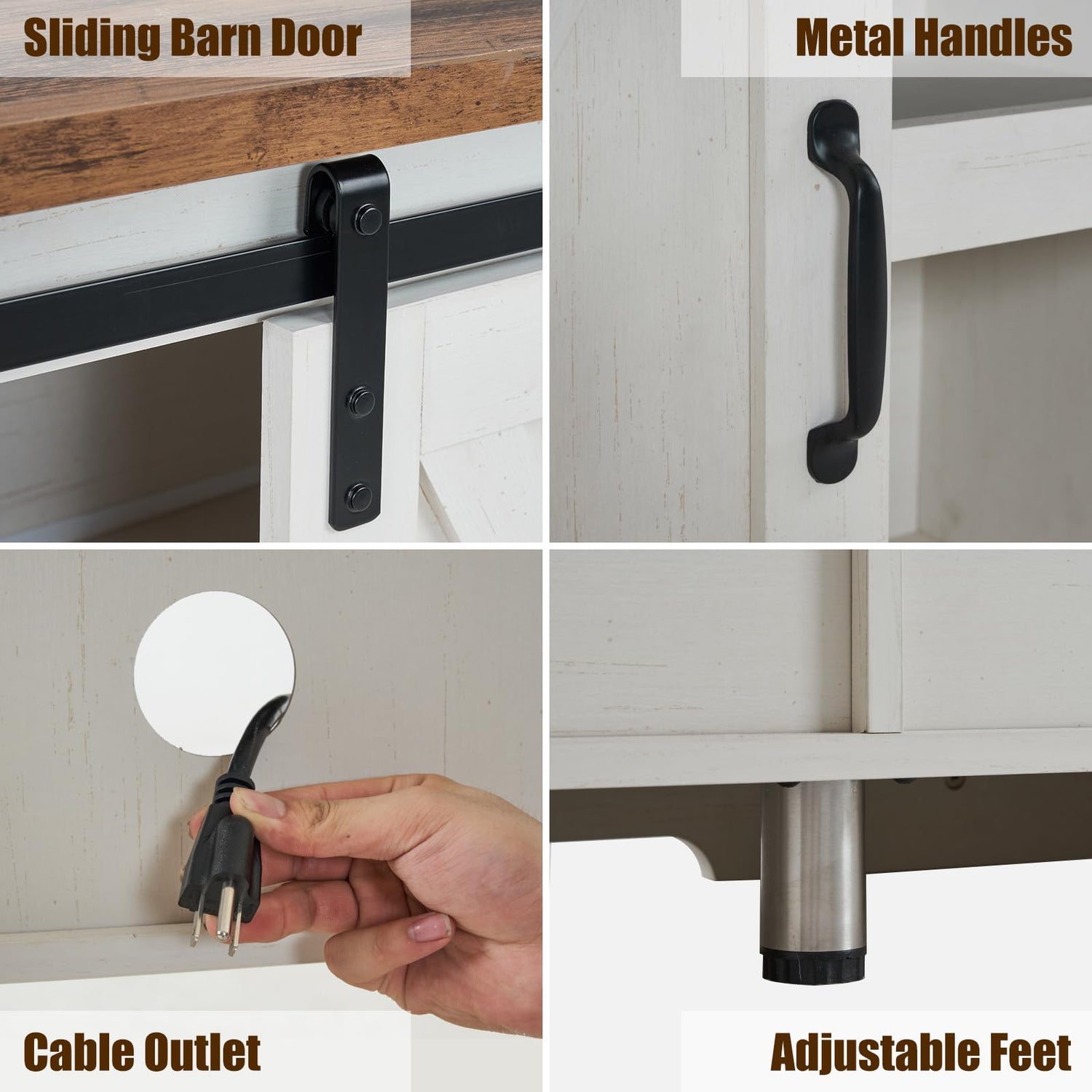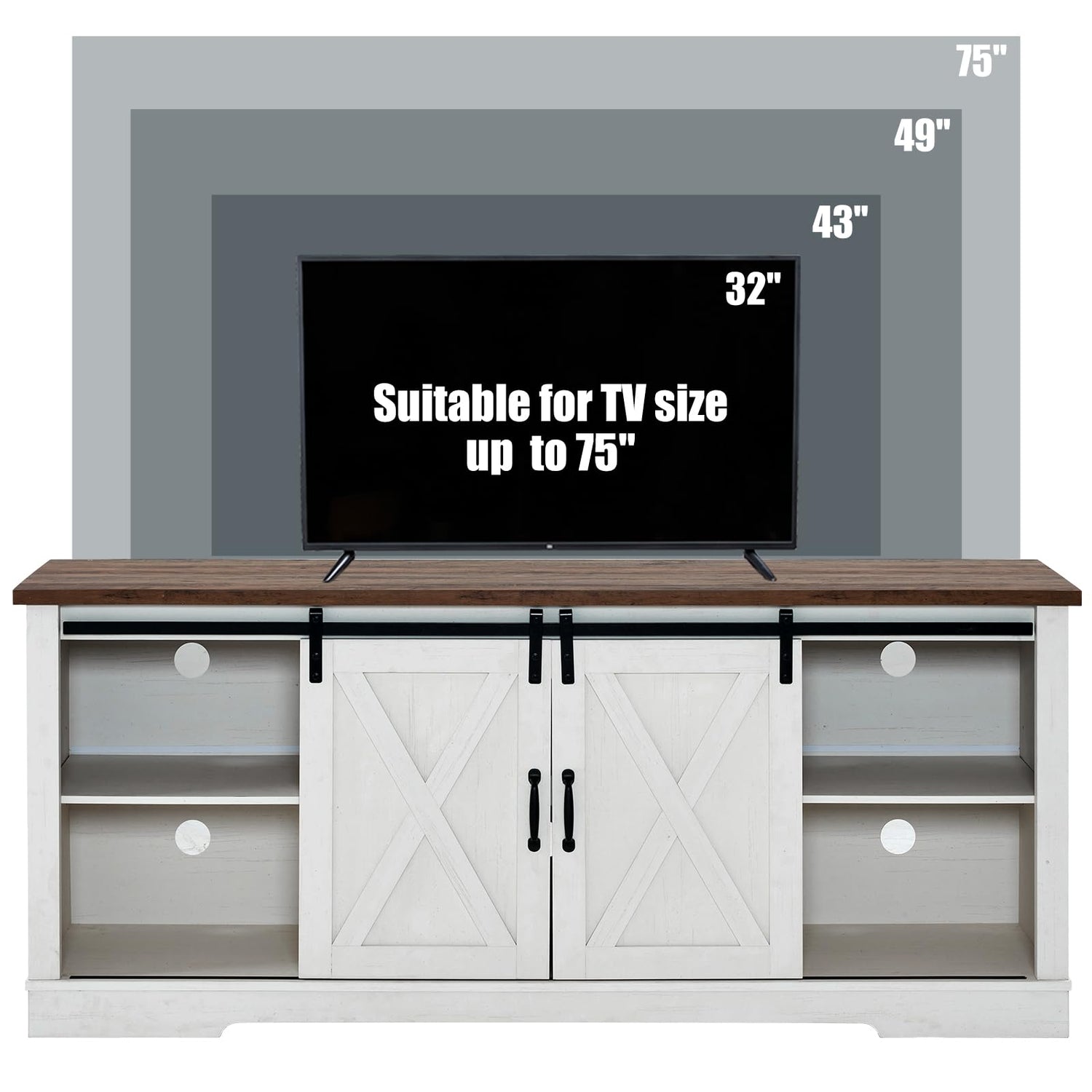 AMERLIFE 66" Farmhouse TV Stand for 75 Inches TVs, Entertainment Center with Sliding Barn Door and Adjustable Shelf & Feet, Console Table with Storage, Distressed White & Rustic