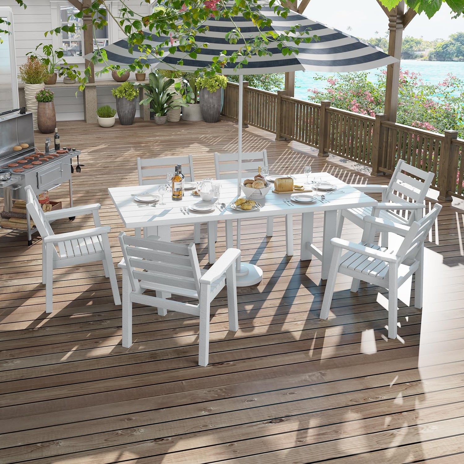 AMERLIFE 7-Piece HDPE Outdoor Dining Table Set with 6 Chairs, 71" L Patio Dining Furniture Set with Umbrella Hole, Modern Dinner Table & Chairs Set for Garden, Backyard, Poolside, White