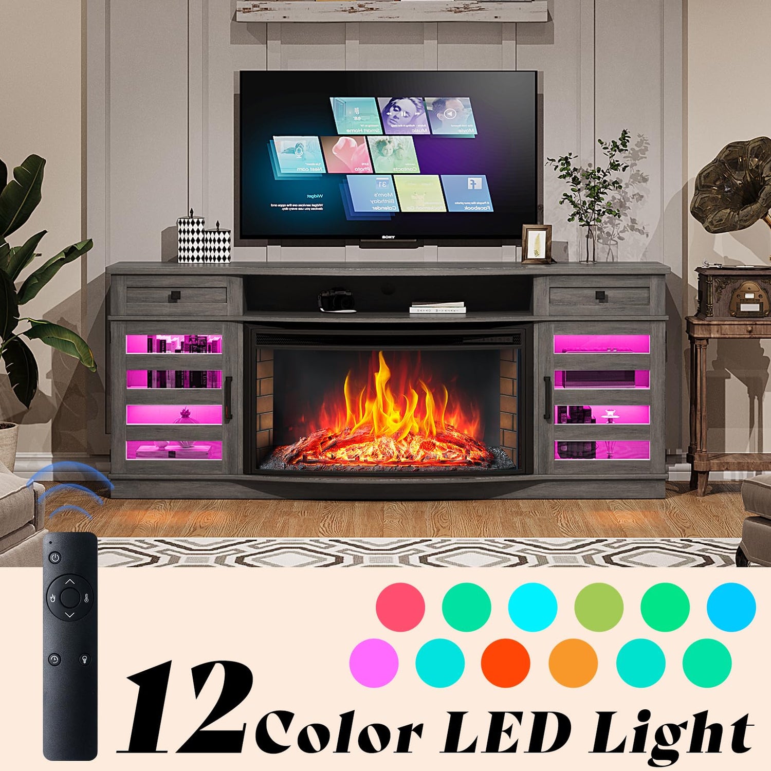 AMERLIFE 70" Curved Fireplace TV Stands with 36'' Electric Fireplace, Farmhouse LED Entertainment Center for TVs up to 80'' with Glass Door & Adjustable Shelves, Wash Gray