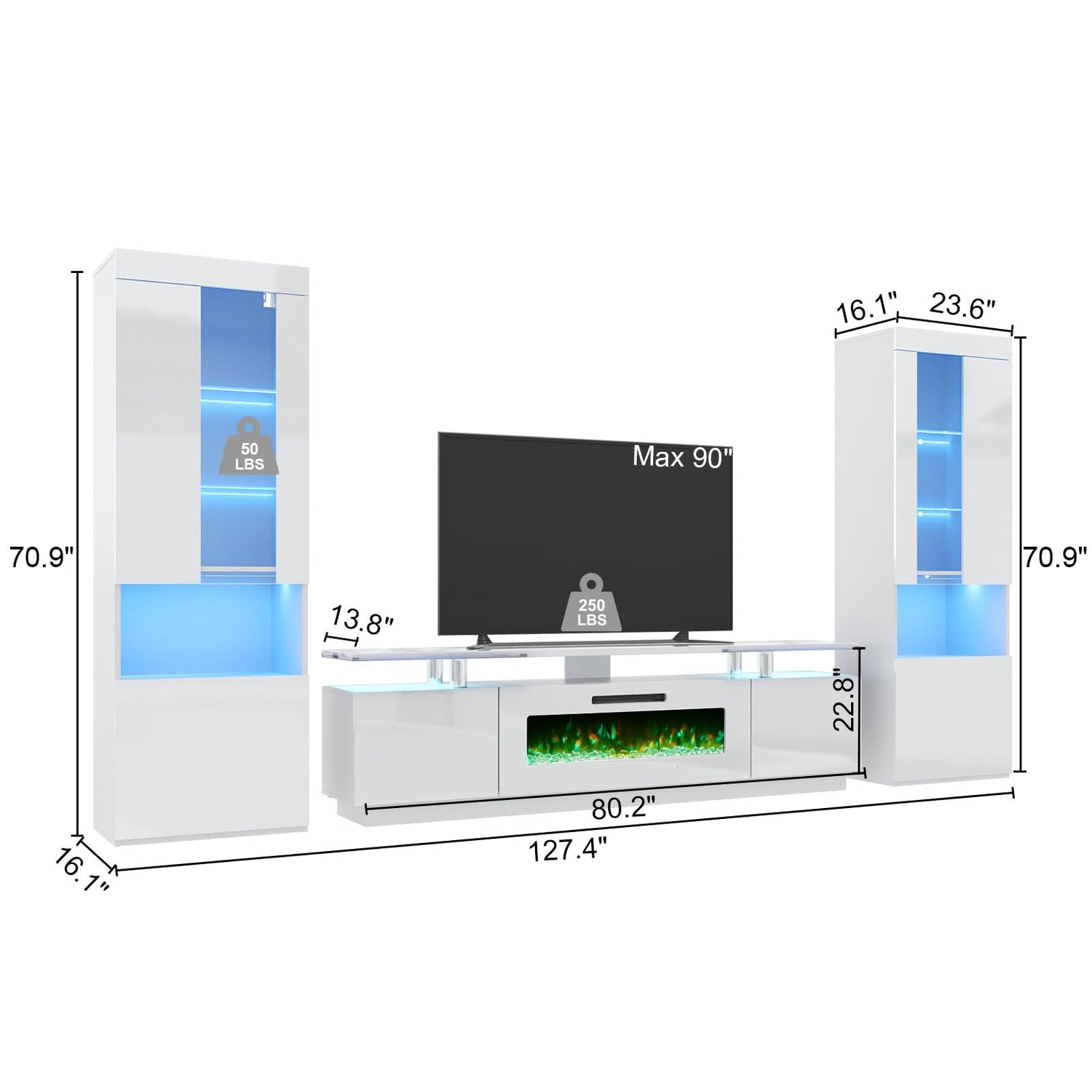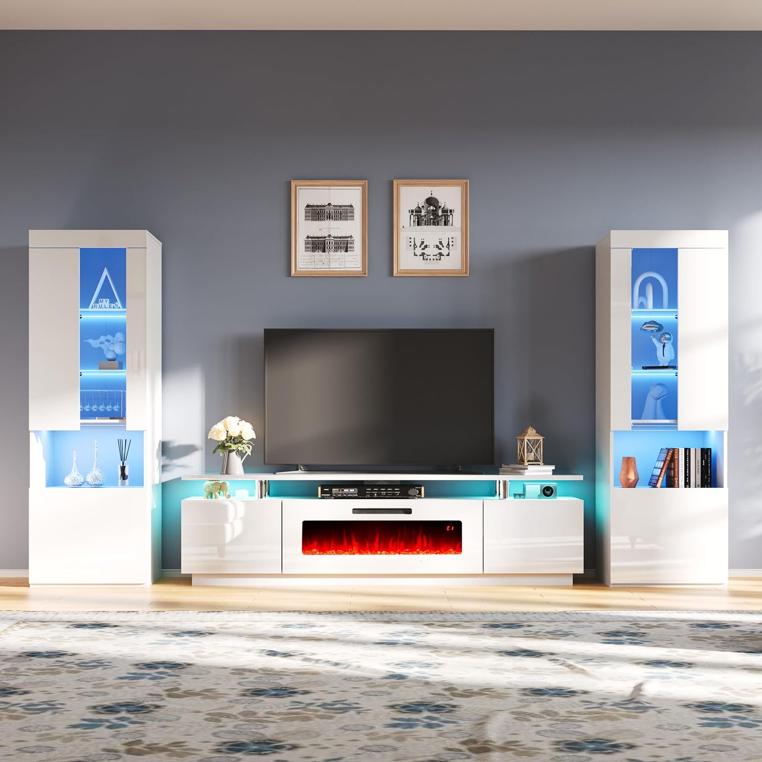 AMERLIFE Entertainment Center with Fireplace and Bookcases, Includes 80" 2-Tier Fireplace TV Stand with 40" Fireplace, 2 x High Gloss Bookshelves with LED Lights & Glass Doors, White